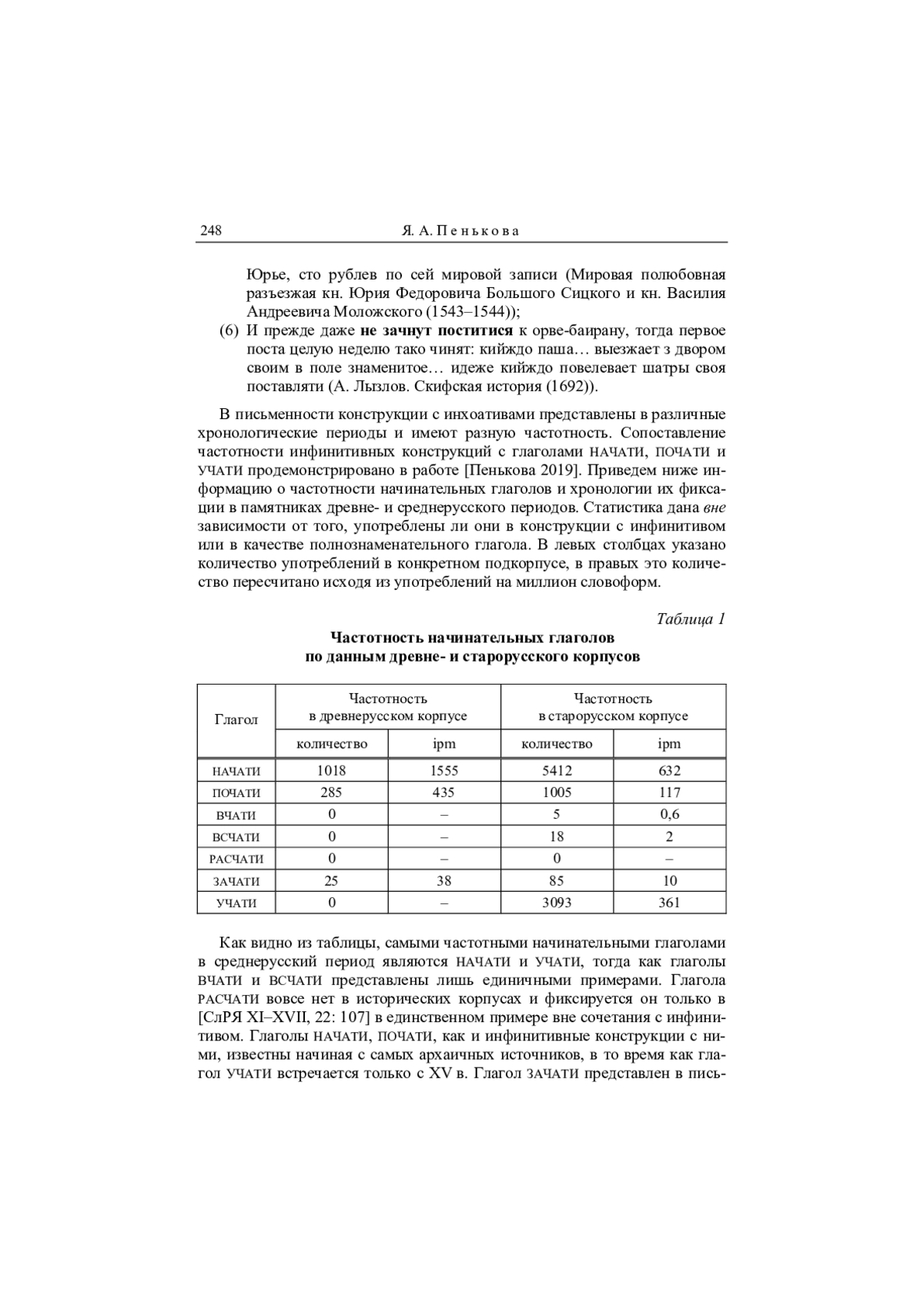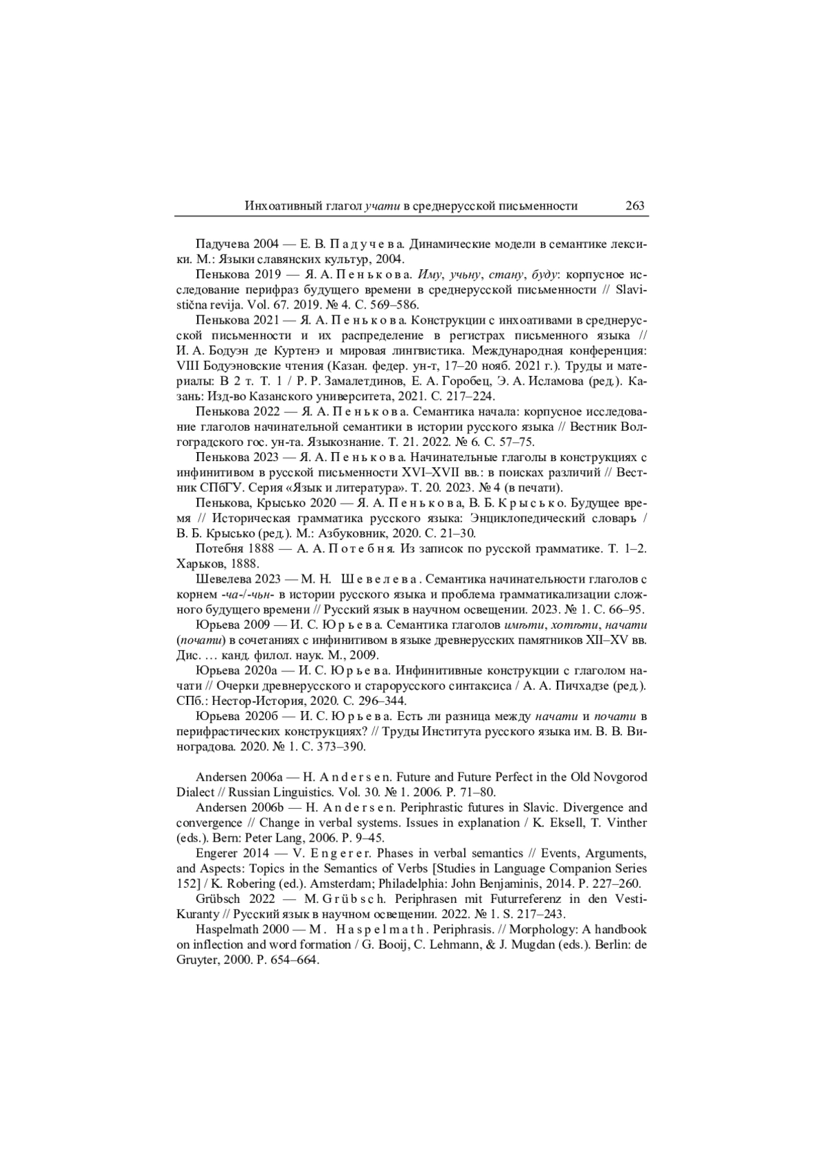 9. Пенькова 2023 - Я. А. Пенькова. Начинательные глаголы в конструкциях с инфинитивом в русской письменности XVI-XVII вв.: в поисках различий // Вестник СПбГУ. Серия “Язык и литература”. Т. 20. 2023. № 4 (в печати).