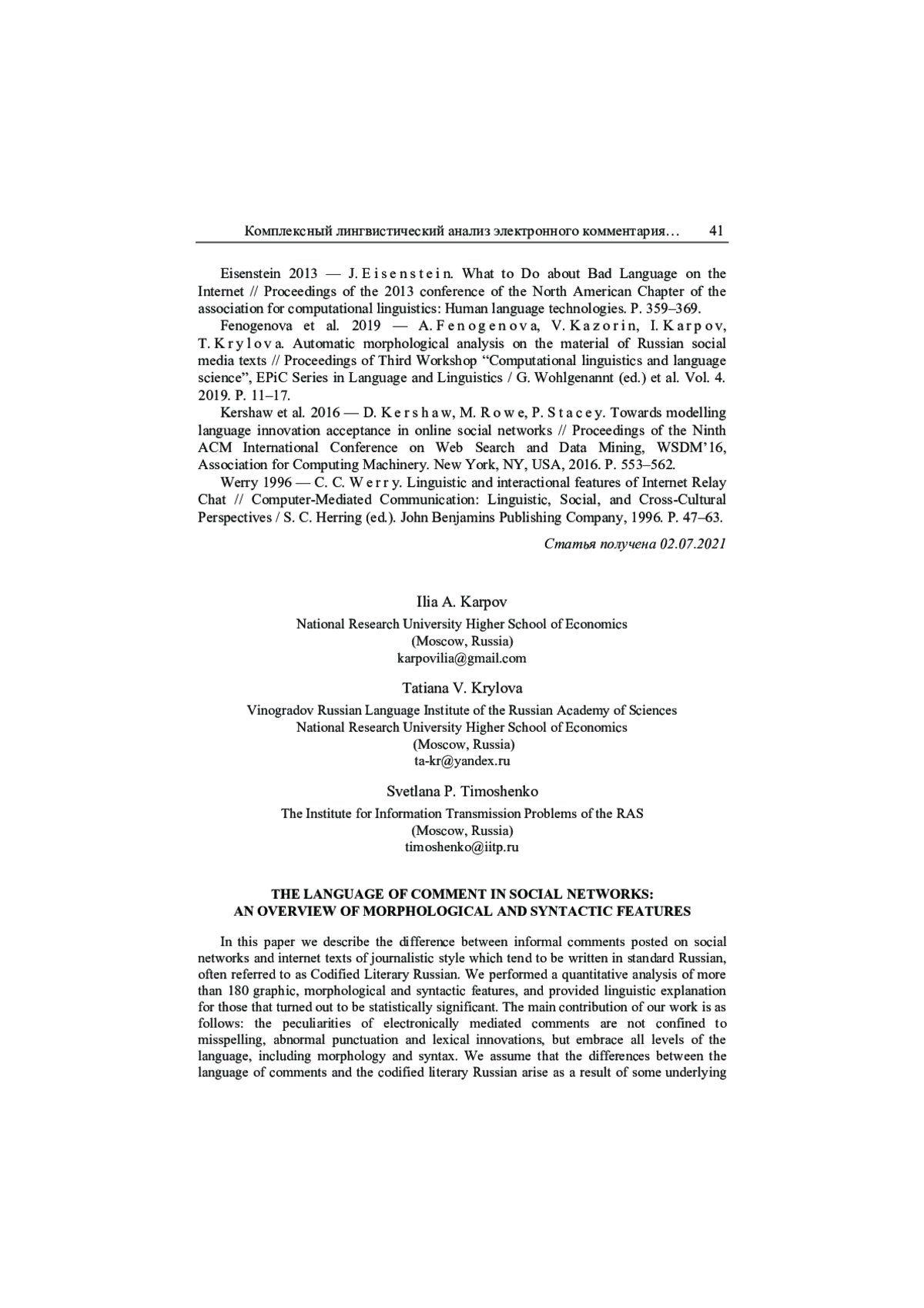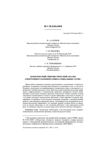 Данная работа посвящена изучению количественных и качественных отличий комментариев, оставляемых пользователями Интернета в социальных сетях, от текстов из Интернета, написанных на кодифицированном литературном языке и относящихся к современному публицистическому стилю. Выполнен количественный анализ ряда графических, морфологических и синтаксических признаков, предпринята попытка интерпретации статистически значимых признаков. В результате анализа показаны отличия электронных комментариев не только на уровне орфографии, пунктуации и лексики, но и на уровне некоторых синтаксических признаков, а также выявлены тенденции, формирующие эти признаки. К ним относятся следующие тенденции: к экономии речевых средств, к расчлененности выражения мысли, к возмещению (под возмещением мы понимаем восполнение информации с тех языковых уровней, которые обычно не передаются на письме). Некоторые из этих тенденций действуют и при порождении устной речи, что объясняет известное сходство между ней и многими текстами из Интернета