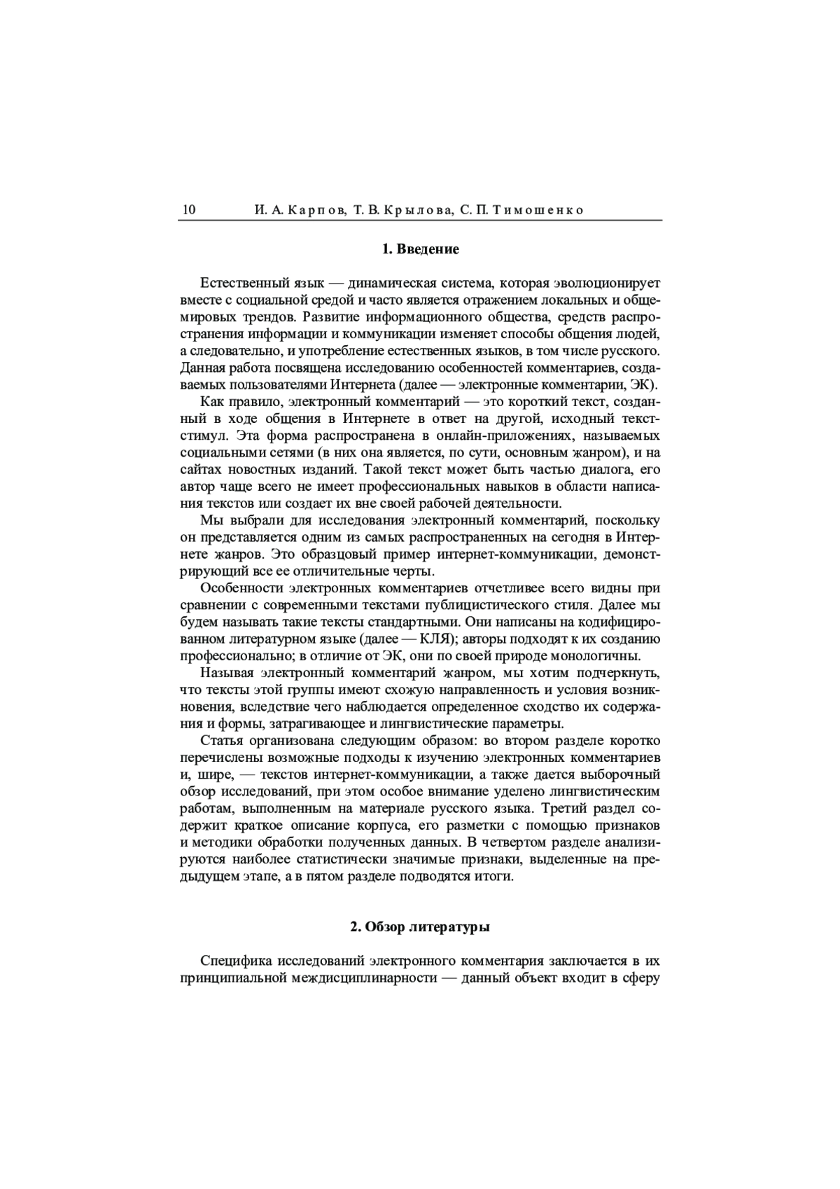Естественный язык — динамическая система, которая эволюционирует вместе с социальной средой и часто является отражением локальных и общемировых трендов. Развитие информационного общества, средств распространения информации и коммуникации изменяет способы общения людей, а следовательно, и употребление естественных языков, в том числе русского. Данная работа посвящена исследованию особенностей комментариев, создаваемых пользователями Интернета (далее — электронные комментарии, ЭК)