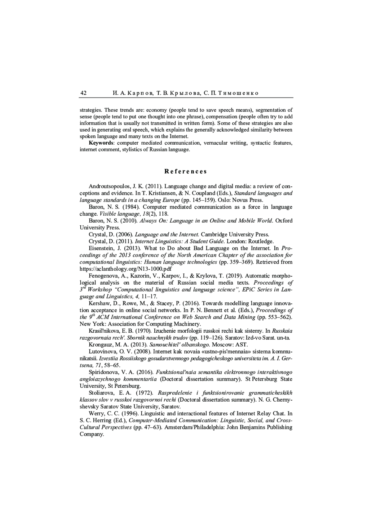 16. Fenogenova et al. 2019 - A. Fenogenova, V. Kazorin, I. Karpov, T. Krylova. Automatic morphological analysis on the material of Russian social media texts // Proceedings of Third Workshop “Computational linguistics and language science”, EPiC Series in Language and Linguistics / G. Wohlgenannt (ed.) et al. Vol. 4. 2019. P. 11-17.