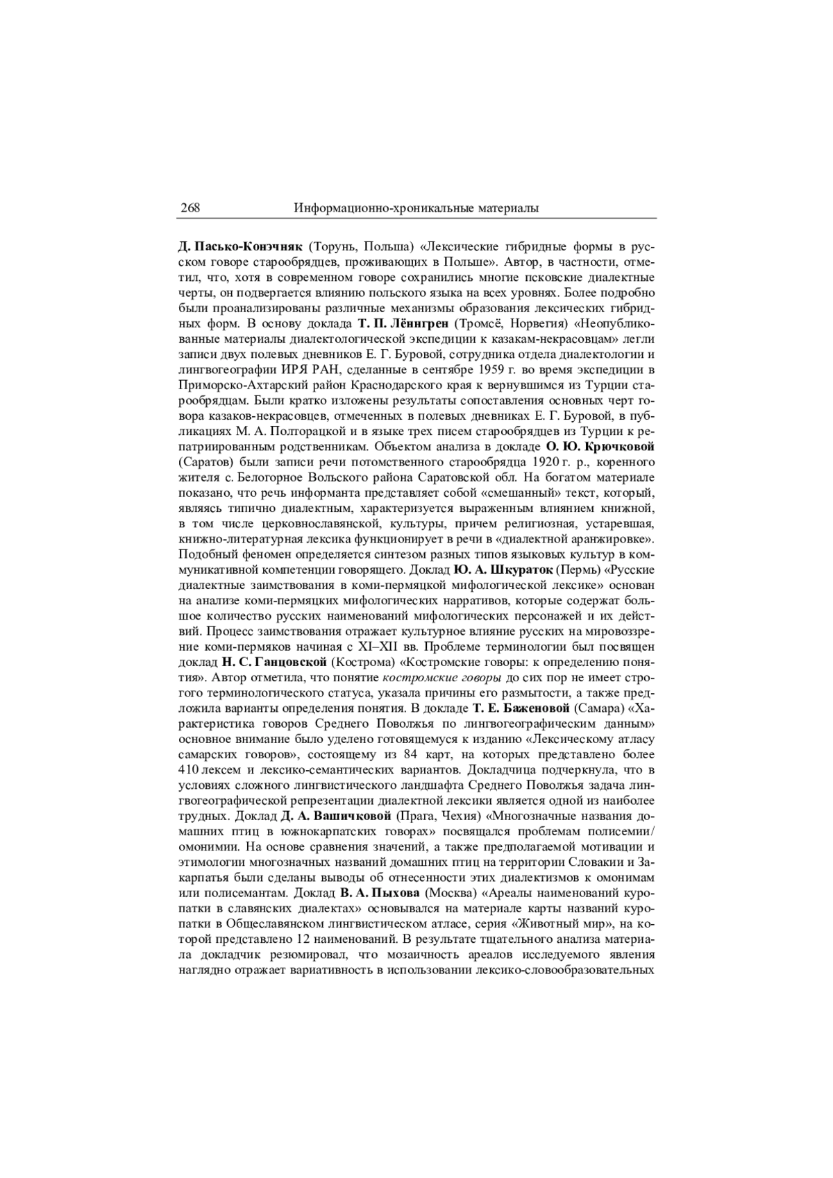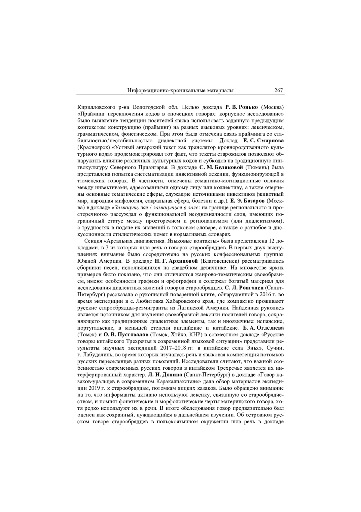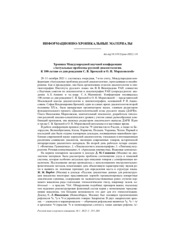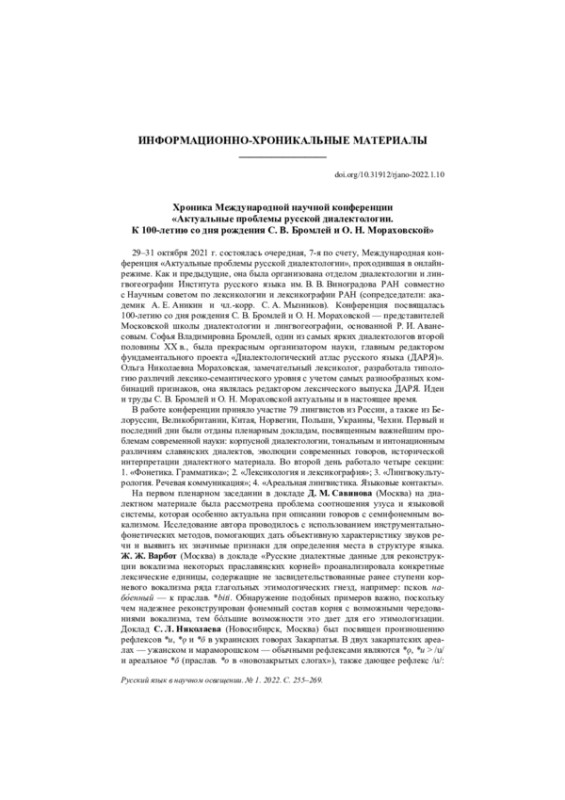 29–31 октября 2021 г. состоялась очередная, 7-я по счету, Международная конференция «Актуальные проблемы русской диалектологии», проходившая в онлайнрежиме. Как и предыдущие, она была организована отделом диалектологии и лингвогеографии Института русского языка им. В. В. Виноградова РАН совместно с Научным советом по лексикологии и лексикографии РАН (сопредседатели: академик А. Е. Аникин и чл.-корр. С. А. Мызников). Конференция посвящалась 100-летию со дня рождения С. В. Бромлей и О. Н. Мораховской — представителей Московской школы диалектологии и лингвогеографии, основанной Р. И. Аванесовым. Софья Владимировна Бромлей, один из самых ярких диалектологов второй половины XX в., была прекрасным организатором науки, главным редактором фундаментального проекта «Диалектологический атлас русского языка (ДАРЯ)». Ольга Николаевна Мораховская, замечательный лексиколог, разработала типологию различий лексико-семантического уровня с учетом самых разнообразных комбинаций признаков, она являлась редактором лексического выпуска ДАРЯ. Идеи и труды С. В. Бромлей и О. Н. Мораховской актуальны и в настоящее время