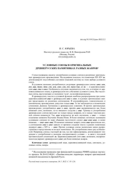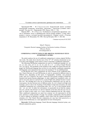 Статья посвящена анализу употребления условных союзов в различных оригинальных древнерусских произведениях. Исследование показало, что памятники XII–XIV вв. демонстрируют неустойчивое состояние языковой системы на этапе выбора условного союза. В условном значении употребляются следующие древнерусские союзы: аже, али, аче, аци, даже, даче, ели, или, оже, оли, оче, пакы (ли), се ли — и церковнославянские аще, еже и иже. Особенность ситуации заключается в том, что, в отличие от церковнославянского языка, в древнерусском нет собственно условного союза. Все частотные союзы, выступающие со значением ‘если’, мультифункциональны. В древнерусских текстах в условной функции наиболее распространены три союза: церковнославянский аще и древнерусские аже и оже, и в разных оригинальных жанрах представлено их различное соотношение. В агиографических, гомилетических и канонических произведениях допустим только аще. То же наблюдается в гномических сочинениях Даниила Заточеника и древнерусских хожениях. В прочих оригинальных произведениях употребляются аже и оже, причём аже воспринимается как более книжный союз, возможно, из-за внешнего сходства с аще. Граница в употреблении древнерусских союзов проходит не только между жанрами, но и между текстами разной степени книжности. Так, аже встречается во всех поучениях, а оже — только в наименее книжном Поучении Иоанна-Илии. В более книжных летописях основными условными союзами по мере убывания частотности служат аще–оже–аже, в менее книжных — оже–аже–аще. В наименее книжных жанрах союза аще практически нет, а соотношение оже и аже зависит от времени создания текста: в ранних памятниках лидирует оже, с XIV в. — аже. Прочие условные союзы значительно менее распространены и представлены не во всех памятниках. Их употребление имеет ряд особенностей. Например, союзы с частицей ли там, где они зафиксированы, демонстрируют тенденцию к употреблению в значении альтернативного условия — в связи с исходной противительной семантикой ли. Церковнославянский союз еже, возможно, воспринимался как вариант древнерусского оже для более книжных жанров.