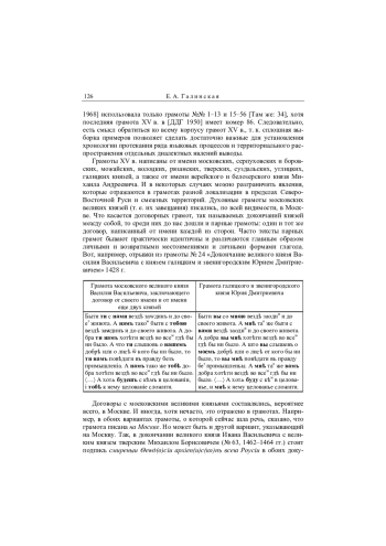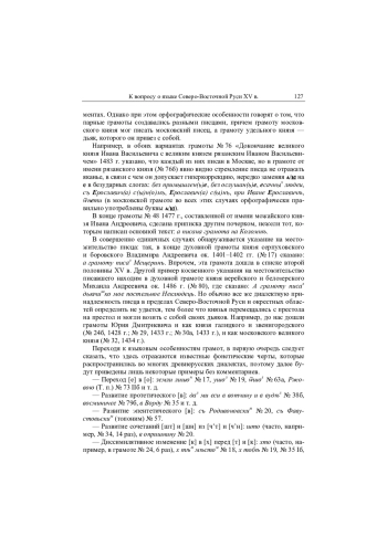 Довольно обширный корпус текстов духовных и договорных грамот великих и удельных князей XV в. отражает фонетические черты говоров Северо-Восточной Руси и некоторых смежных областей, в том числе черты нетривиальные — реализацию предлога «к» в [x] перед фрикативным согласным (х своему), регрессивную ассимиляцию гласных (су удѣла). Но наиболее существенно то, что грамоты дают новый материал относительно распространения ряда известных диалектных явлений и уточняют хронологию их возникновения либо временны́е границы их существования. Так, выяснилось, что в тверских говорах, в отличие от других говоров центра, в XV в. еще сохранялись мягкие шипящие [ш’] и [ж’]. В то же время в этот период в диалектах Северо-Восточной Руси уже распространились твердые долгие и/или сложные глухие и звонкие шипящие. До сих пор самым ранним из найденных примеров оглушения /в/ в [ф] считалось написание фпрок из грамоты 1501 г., но теперь обнаружилась орфограмма Витоѳтъ в списке XV в. с грамоты 1402 г. и гиперкорректное написание девтеремъ («дефтерь» — ‘ханская налоговая грамота’) в текстах 1434 и 1436 гг. Если раньше считалось, что отвердение аффрикаты /ц/ относится к концу XV в., то сейчас оказалось, что самый ранний пример отражения твердого [ц] датируется 1428 г. Из этого следует, что фонетический переход [e] в [o] после мягких согласных перед твердыми, который завершился до отвердения /ц/, должен был окончиться не позднее чем в начале XV в. В говорах Северо-Восточной Руси сохранялись древние причастные формы типа вынемши, которые ныне в говорах этой территории отсутствуют. Такая инновация, как стяженные формы презенса типа сказывашь, развилась в говорах великорусского центра не позже XV в
