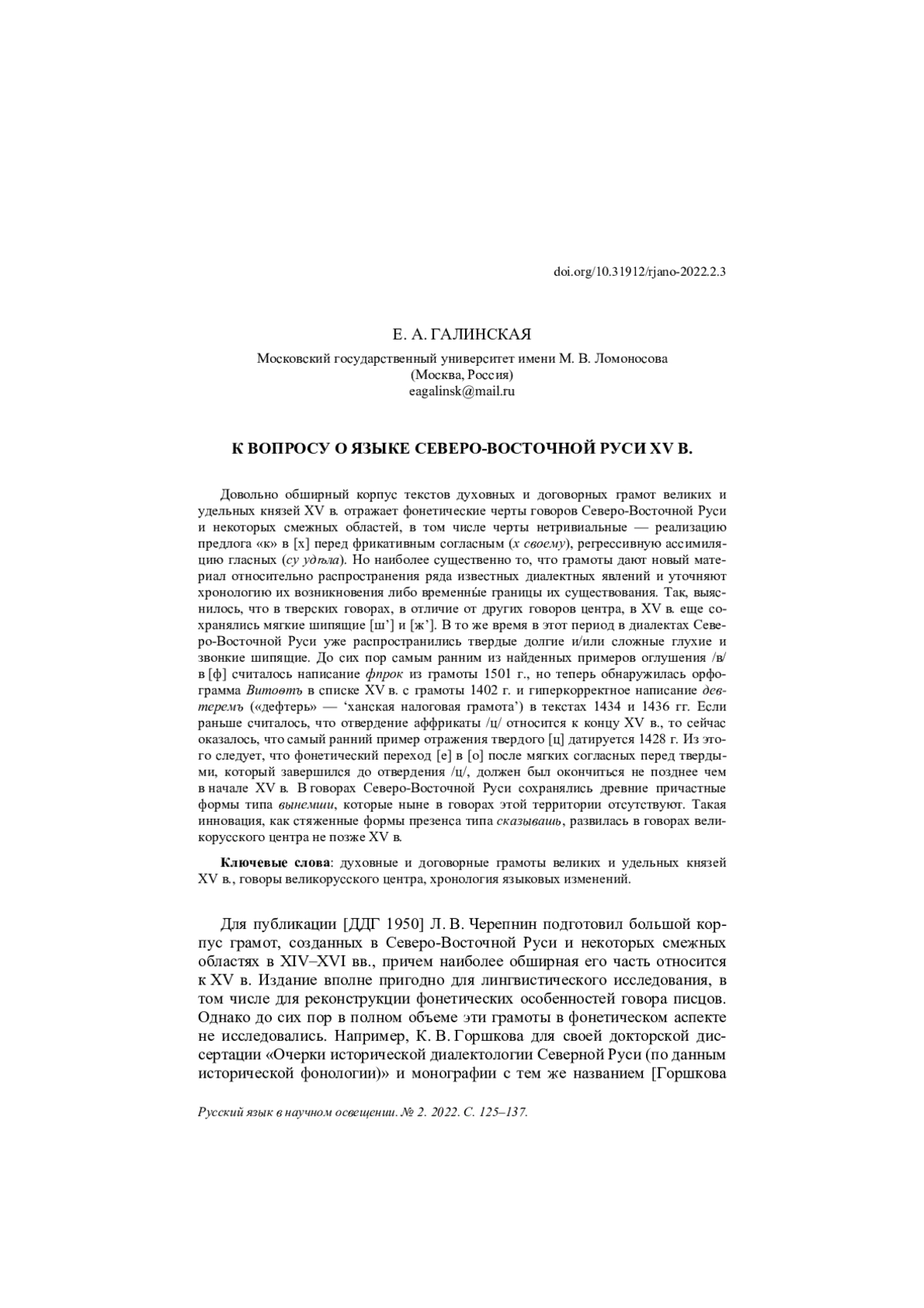 Для публикации [ДДГ 1950] Л. В. Черепнин подготовил большой корпус грамот, созданных в Северо-Восточной Руси и некоторых смежных областях в XIV–XVI вв., причем наиболее обширная его часть относится к XV в. Издание вполне пригодно для лингвистического исследования, в том числе для реконструкции фонетических особенностей говора писцов. Однако до сих пор в полном объеме эти грамоты в фонетическом аспекте не исследовались.