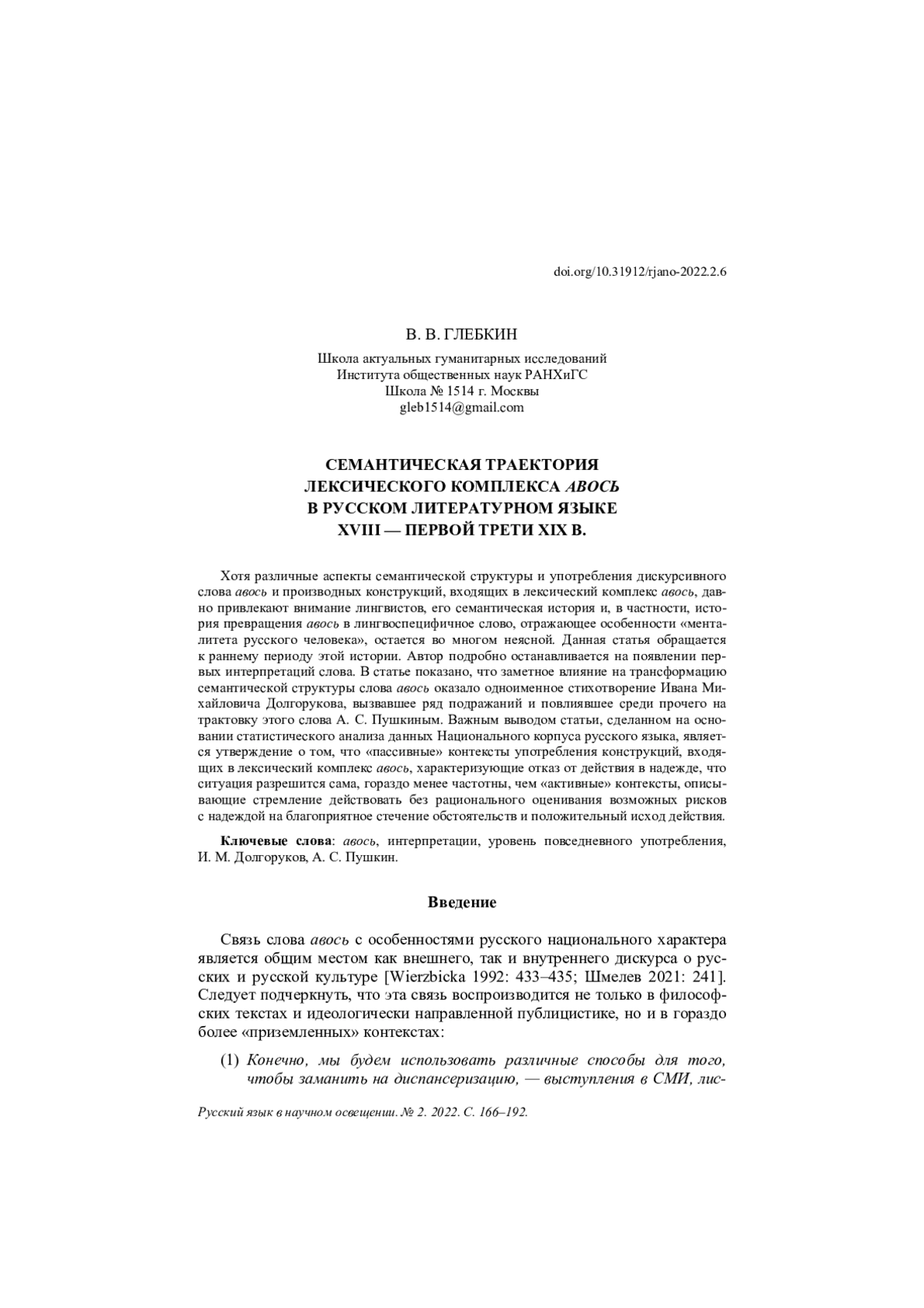Хотя различные аспекты семантической структуры и употребления дискурсивного слова авось и производных конструкций, входящих в лексический комплекс авось, давно привлекают внимание лингвистов, его семантическая история и, в частности, история превращения авось в лингвоспецифичное слово, отражающее особенности «менталитета русского человека», остается во многом неясной. Данная статья обращается к раннему периоду этой истории. Автор подробно останавливается на появлении первых интерпретаций слова. В статье показано, что заметное влияние на трансформацию семантической структуры слова авось оказало одноименное стихотворение Ивана Михайловича Долгорукова, вызвавшее ряд подражаний и повлиявшее среди прочего на трактовку этого слова А. С. Пушкиным. Важным выводом статьи, сделанном на основании статистического анализа данных Национального корпуса русского языка, является утверждение о том, что «пассивные» контексты употребления конструкций, входящих в лексический комплекс авось, характеризующие отказ от действия в надежде, что ситуация разрешится сама, гораздо менее частотны, чем «активные» контексты, описывающие стремление действовать без рационального оценивания возможных рисков с надеждой на благоприятное стечение обстоятельств и положительный исход действия