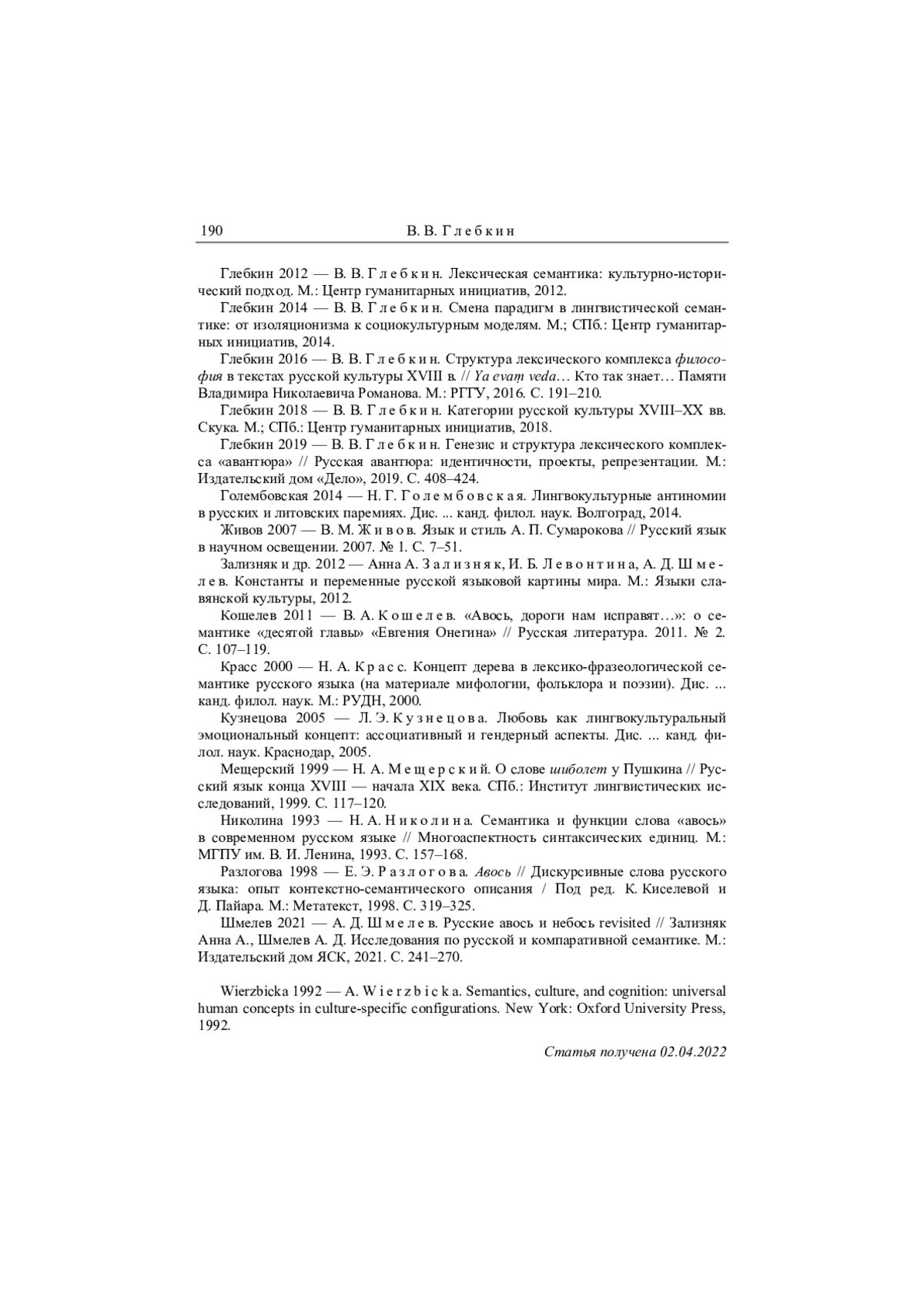 21. Глебкин 2012 - В. В. Глебкин. Лексическая семантика: культурно-исторический подход. М.: Центр гуманитарных инициатив, 2012. EDN: TGEFRN