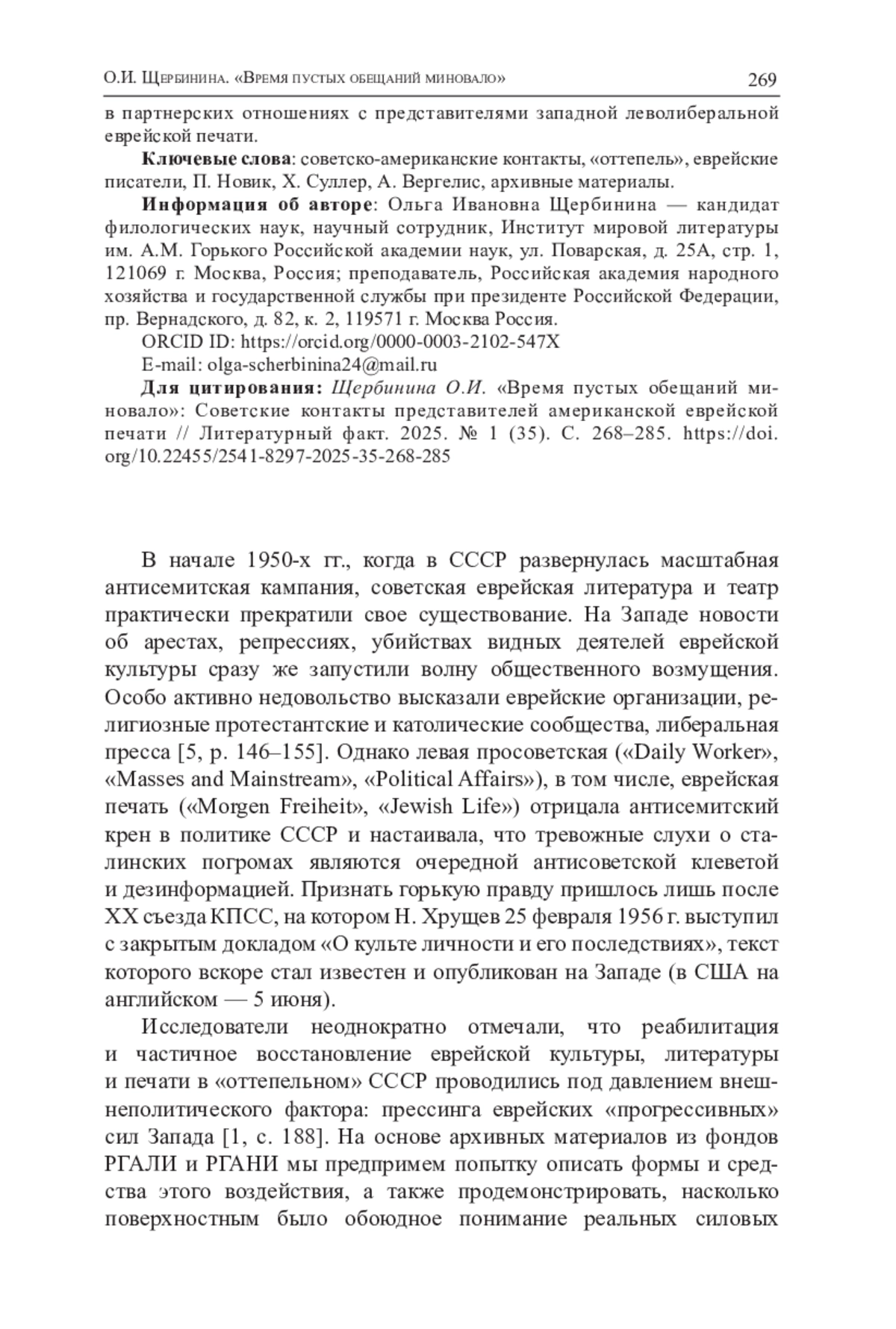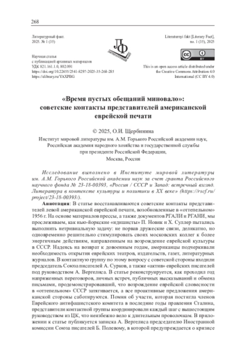 4. Щербинина О.И. “Уплывало семеро романтиков”. Первая поездка группы советских журналистов в США эпохи “оттепели” // Литературный факт. 2023. № 3 (29). С. 293-322. DOI: 10.22455/2541-8297-2023-29-293-322 EDN: GDELSW