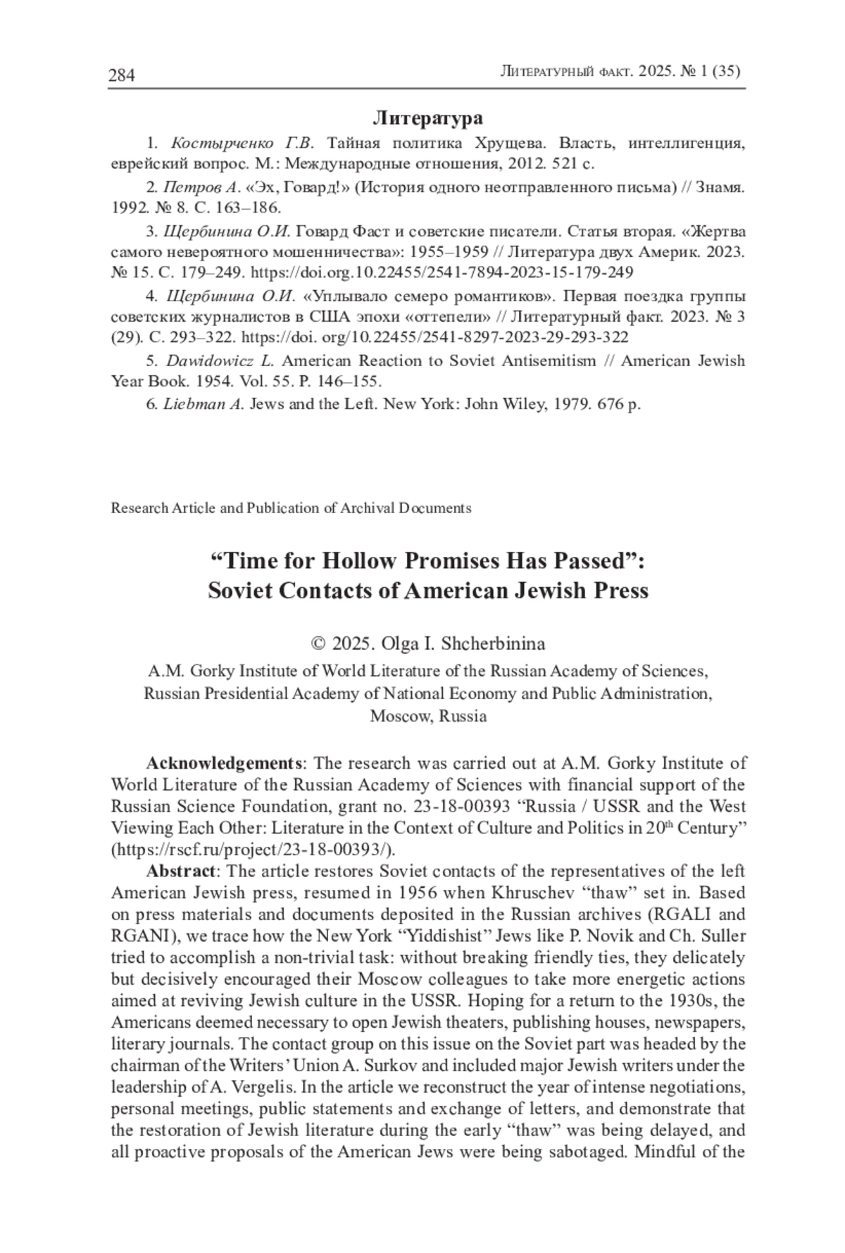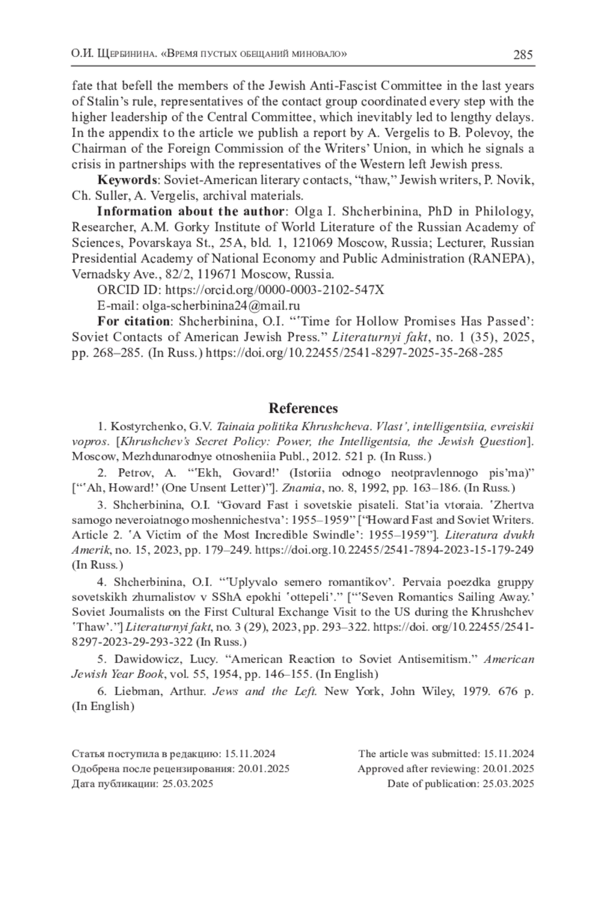 3. Щербинина О.И. Говард Фаст и советские писатели. Статья вторая. “Жертва самого невероятного мошенничества”: 1955-1959 // Литература двух Америк. 2023. № 15. C. 179-249. https://doi.org. DOI: 10.22455/2541-7894-2023-15-179-249 EDN: QDWBFG