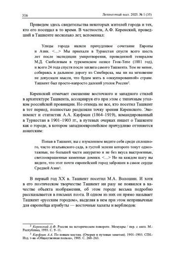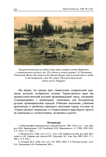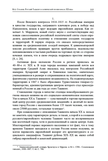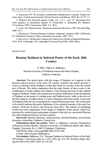 В статье рассматривается образ Ташкента в том виде, каким он складывается в русской сатирической поэзии начала ХХ в. Первоначально дается обзор очерков о Ташкенте того времени, сделанных путешественниками из центральной части России. Подчеркивается, что основная черта этих работ - соединение в культурном облике Ташкента азиатских реалий и признаков русской провинции. Далее путем сопоставления выявляются различия в описаниях Ташкента в стихотворениях приезжих поэтов и поэтов-ташкентцев: если в текстах первой категории авторов наблюдается органичное сочетание русских и азиатских мотивов, то в текстах ташкентских поэтов город изображается только как типичная российская провинция. В основной части статьи дан анализ стихотворных фельетонов двух сатирических журналов начала прошлого столетия - «Туркестанского скорпиона» и «Туркестанского Кара-Курта». Методом каталогизации выявляются основные составляющие образа Ташкента того периода, который изображался поэтами-сатириками (постоянными жителями города) как провинциальный российский город с минимальными вкраплениями азиатских реалий.