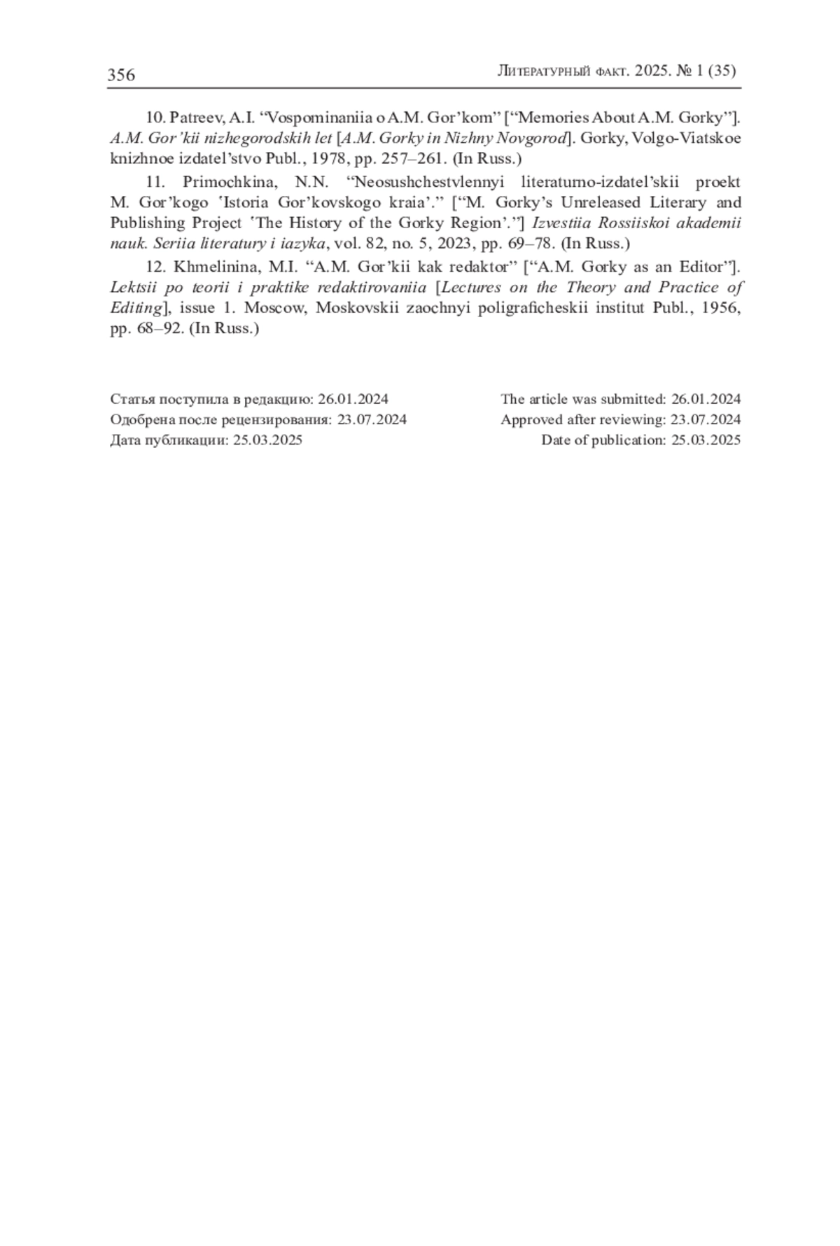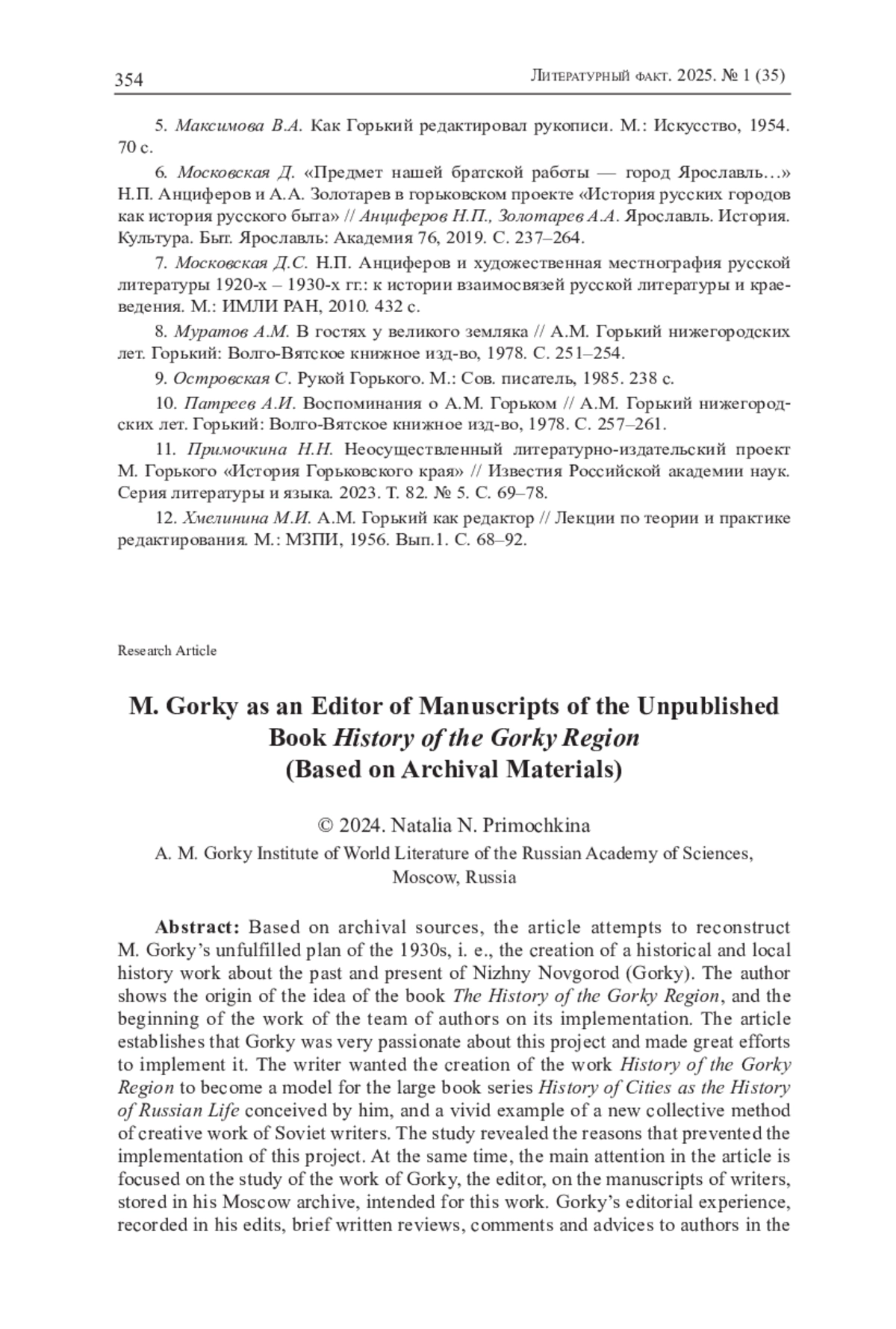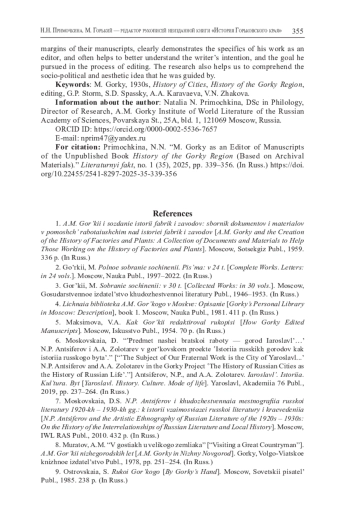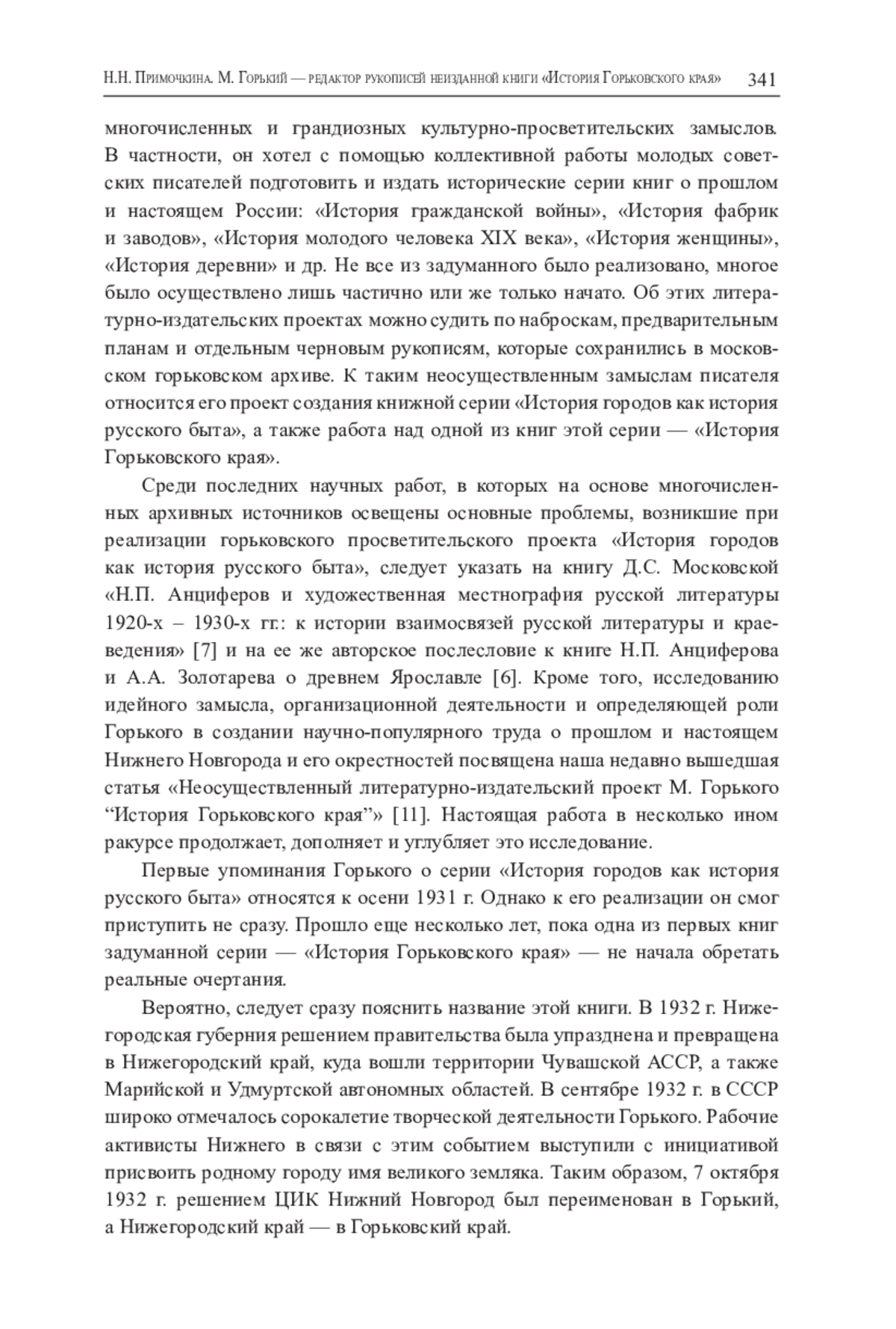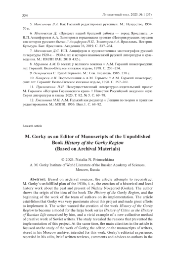 11. Примочкина Н.Н. Неосуществленный литературно-издательский проект М. Горького “История Горьковского края” // Известия Российской академии наук. Серия литературы и языка. 2023. Т. 82. № 5. С. 69-78.