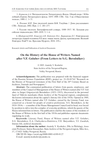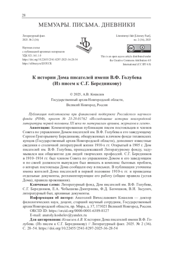 Комментированная публикация писем постояльцев и членов Совета по управлению Домом писателей им. В. Ф. Голубева к его заведующему Сергею Григорьевичу Бередникову, обнаруженных в личном фонде тихвинских купцов (Государственный архив Новгородской области), дополняет известные сведения о столичной литературной жизни 1910-х гг. Открытый в 1905 г. Дом писателей им. В. Ф. Голубева, принадлежавший Литературному фонду, задумывался как общежитие для людей творческих профессий. С. Г. Бередников в 1910-1914 гг. был членом Совета по управлению Домом и его заведующим и по своей должности вынужден был вникать в комплекс бытовых проблем, о которых постояльцы Дома сообщали ему в письмах. В публикации уточнены имена жителей Дома писателей в первой половине 1910-х гг. и приведены отдельные документы, регламентирующие его работу (общие правила (устав Дома), правила проживания).