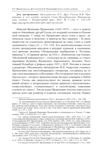 Статья посвящена одной из малоизученных страниц биографии Николая Яковлевича Прокоповича (1810-1857), друга Гоголя с детских лет, редактора и издателя его сочинений, поэта и педагога. После окончания Нежинской гимназии Прокопович приехал в Петербург и поступил на драматическое отделение столичного Театрального училища, а затем, по завершении обучения, несколько лет прослужил актером Санкт-Петербургской труппы Императорских театров. В статье сообщаются новые сведения о его театральной карьере и пьесах, в которых играли он и его жена, также начинающая актриса М. Н. Трохнева. Показано, что Прокопович на протяжении своей недолгой сценической деятельности успел сыграть во многих спектаклях, но ему доставались лишь эпизодические и выходные роли; тем не менее Гоголь, поддерживавший с ним близкие отношения, мог посещать пьесы с его участием. В статье рассматривается круг этих постановок, что позволяет составить представление о характере театрального репертуара 1830-х гг. и убедиться в том, что драматические традиции, воплощенные в этих спектаклях, были переосмыслены Гоголем в его собственных комедиях. Приведенный материал изучается в связи со взглядами Гоголя на особенности отечественного театра, высказанными им в заметке о петербургской сцене в 1835-1836 гг.