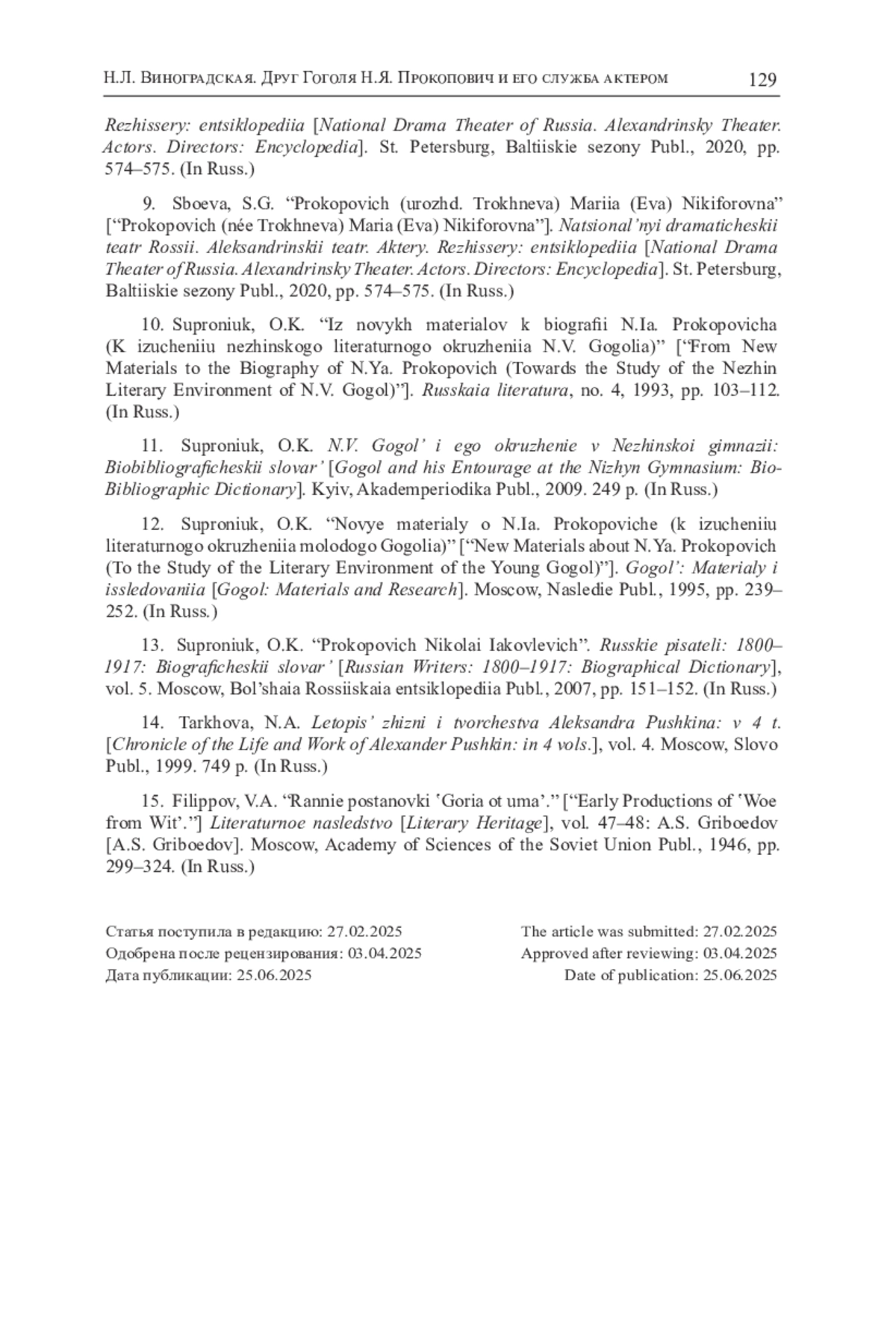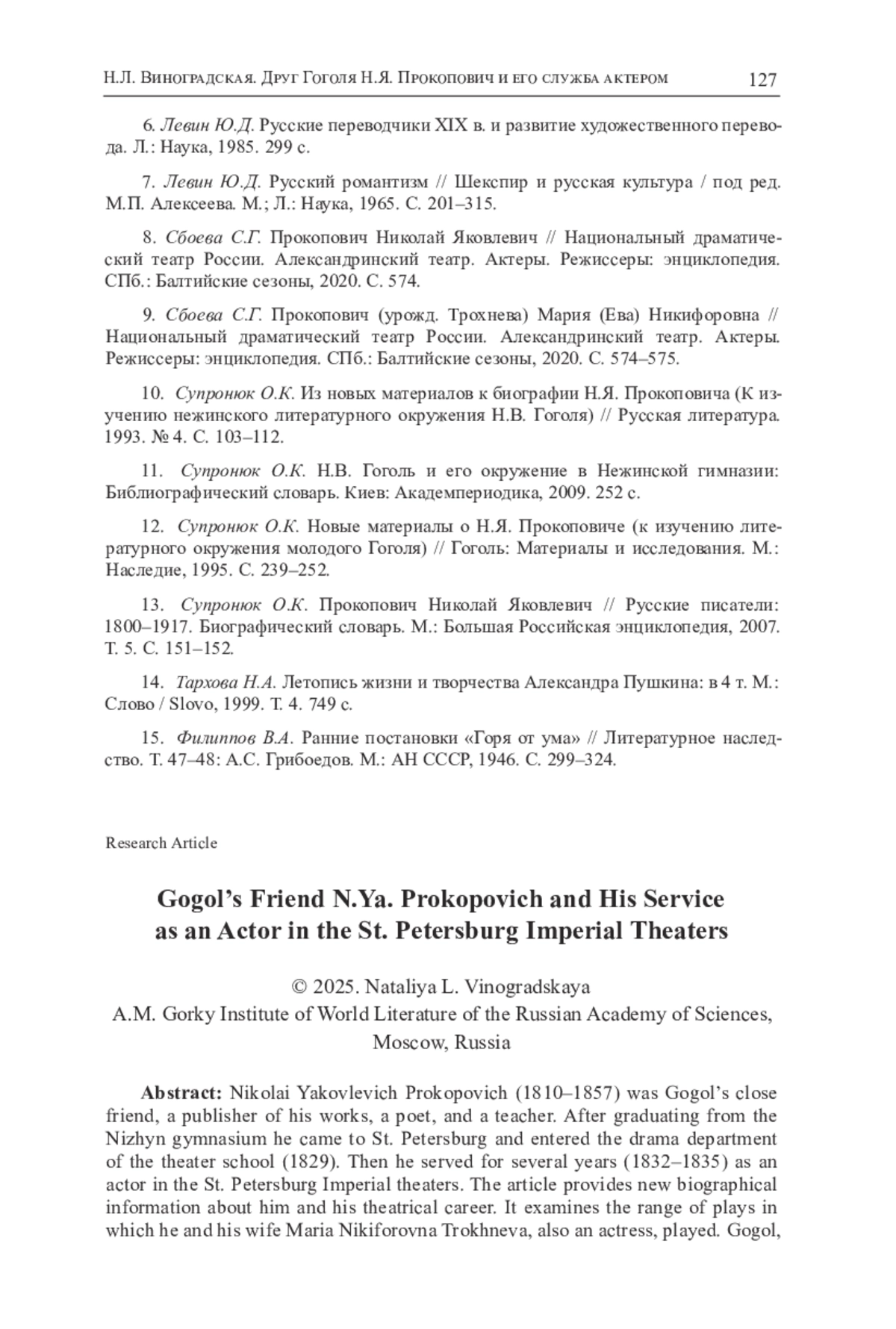 12. Супронюк О.К. Новые материалы о Н.Я. Прокоповиче (к изучению литературного окружения молодого Гоголя) // Гоголь: Материалы и исследования. М.: Наследие, 1995. С. 239-252.