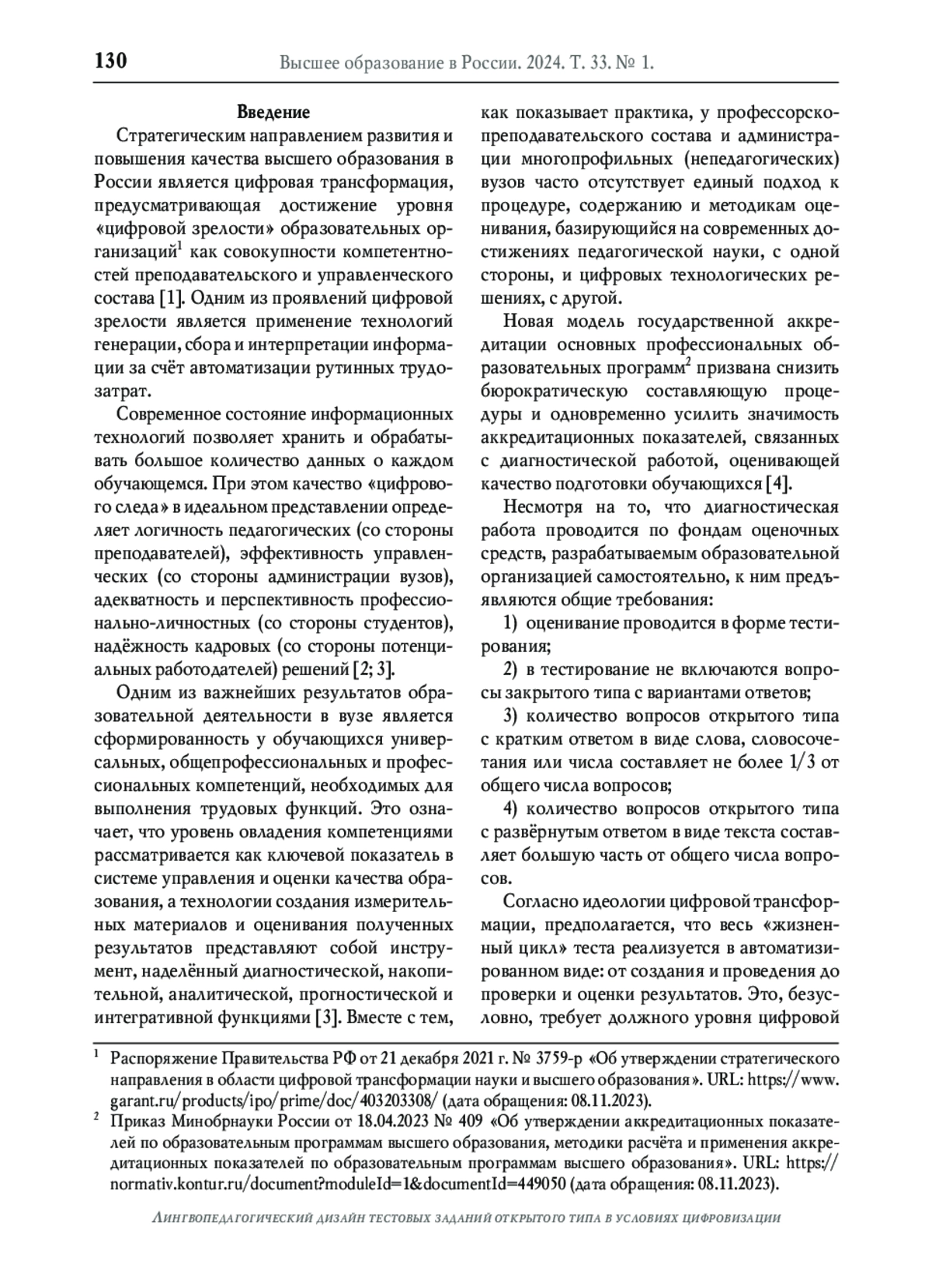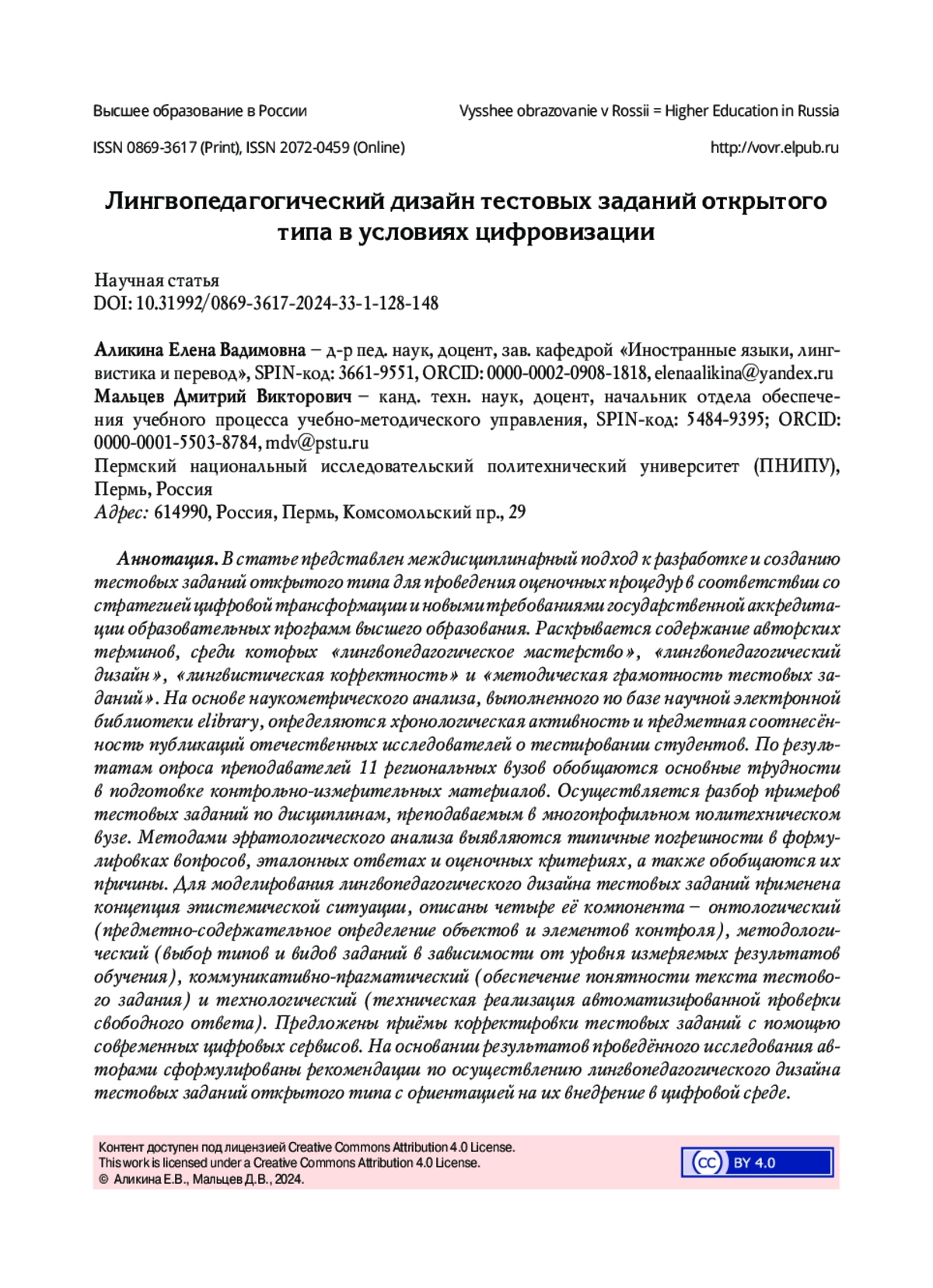 В статье представлен междисциплинарный подход к разработке и созданию тестовых заданий открытого типа для проведения оценочных процедур в соответствии со стратегией цифровой трансформации и новыми требованиями государственной аккредитации образовательных программ высшего образования. Раскрывается содержание авторских терминов, среди которых «лингвопедагогическое мастерство», «лингвопедагогический дизайн», «лингвистическая корректность» и «методическая грамотность тестовых заданий». На основе наукометрического анализа, выполненного по базе научной электронной библиотеки elibrary, определяются хронологическая активность и предметная соотнесённость публикаций отечественных исследователей о тестировании студентов. По результатам опроса преподавателей 11 региональных вузов обобщаются основные трудности в подготовке контрольно-измерительных материалов. Осуществляется разбор примеров тестовых заданий по дисциплинам, преподаваемым в многопрофильном политехническом вузе. Методами эрратологического анализа выявляются типичные погрешности в формулировках вопросов, эталонных ответах и оценочных критериях, а также обобщаются их причины. Для моделирования лингвопедагогического дизайна тестовых заданий применена концепция эпистемической ситуации, описаны четыре её компонента - онтологический (предметно-содержательное определение объектов и элементов контроля), методологический (выбор типов и видов заданий в зависимости от уровня измеряемых результатов обучения), коммуникативно-прагматический (обеспечение понятности текста тестового задания) и технологический (техническая реализация автоматизированной проверки свободного ответа). Предложены приёмы корректировки тестовых заданий с помощью современных цифровых сервисов. На основании результатов проведённого исследования авторами сформулированы рекомендации по осуществлению лингво-педагогического дизайна тестовых заданий открытого типа с ориентацией на их внедрение в цифровой среде.