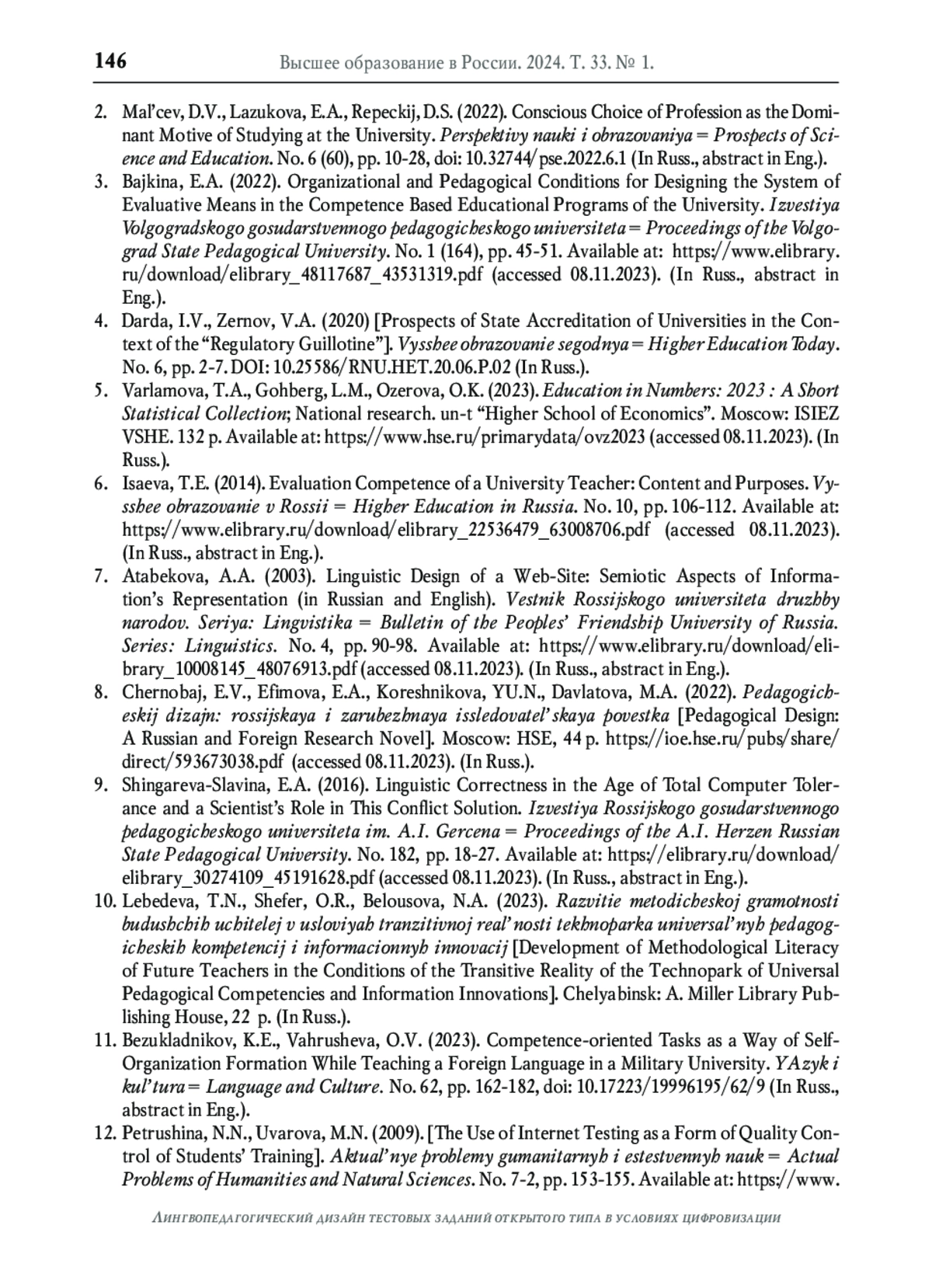 2. Мальцев Д.В., Лазукова Е.А., Репецкий Д.С. Осознанный выбор профессии как доминантный мотив обучения в университете // Перспективы науки и образования. 2022. №6 (60). С. 10-28. DOI: 10.32744/pse.2022.6.1 EDN: AMJZMP
