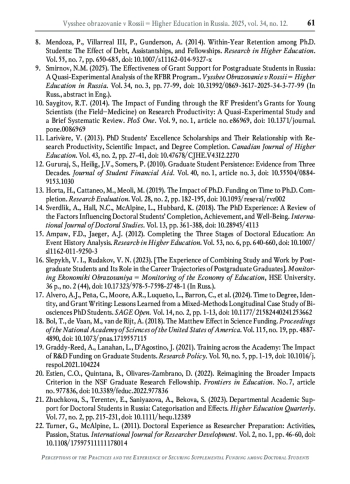 3. Maloshonok N., Terentev E. National barriers to the completion of doctoral programs at Russian universities // Higher Education. 2019. Vol. 77. No. 2. P. 195-211. DOI: 10.1007/s10734-018-0267-9 EDN: ZKHPMY