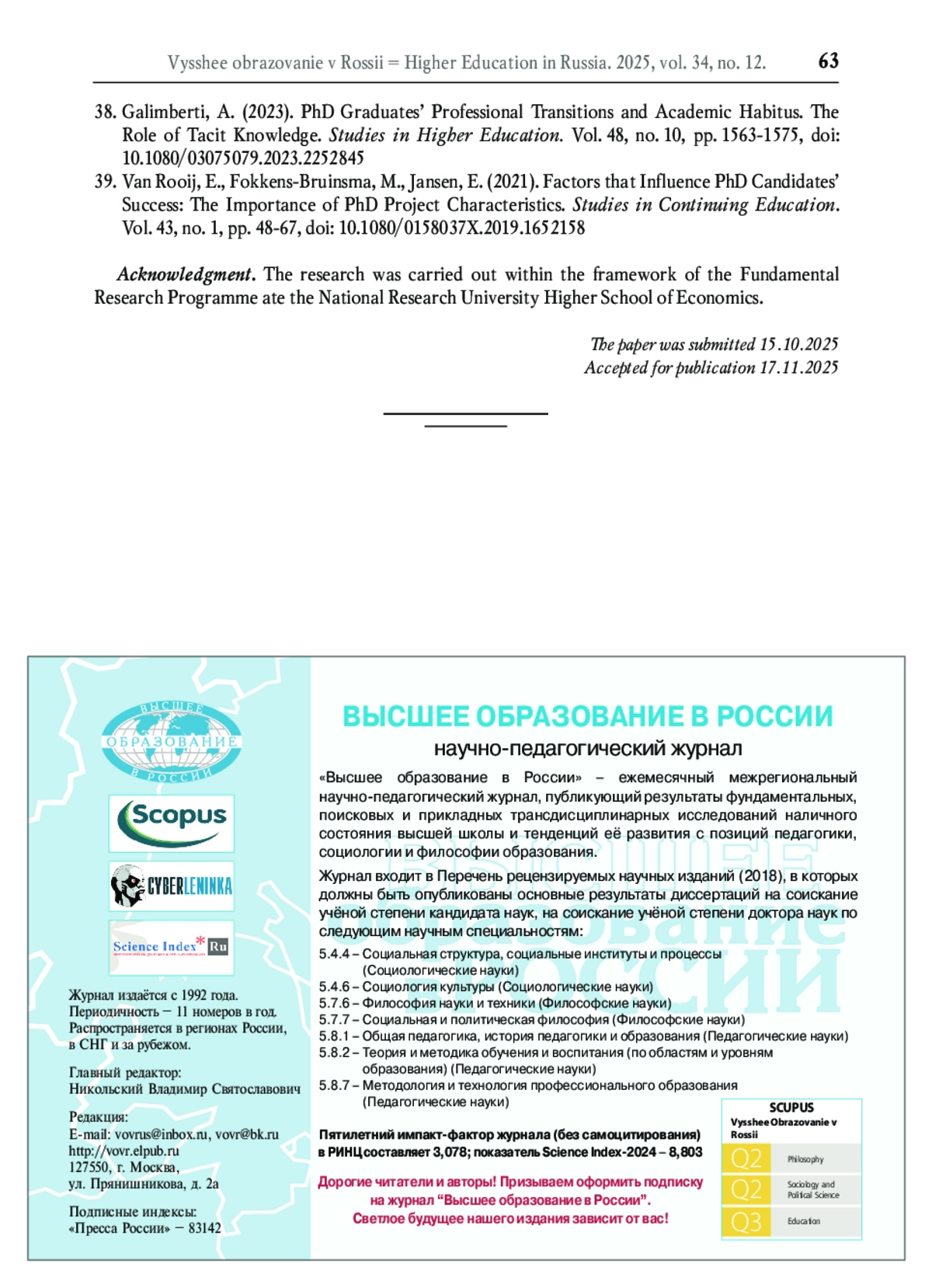 38. Galimberti A. PhD graduates’ professional transitions and academic habitus. The role of tacit knowledge // Studies in Higher Education. 2023. Vol. 48. No. 10. P. 1563-1575. DOI: 10.1080/03075079.2023.2252845 EDN: KZETSF