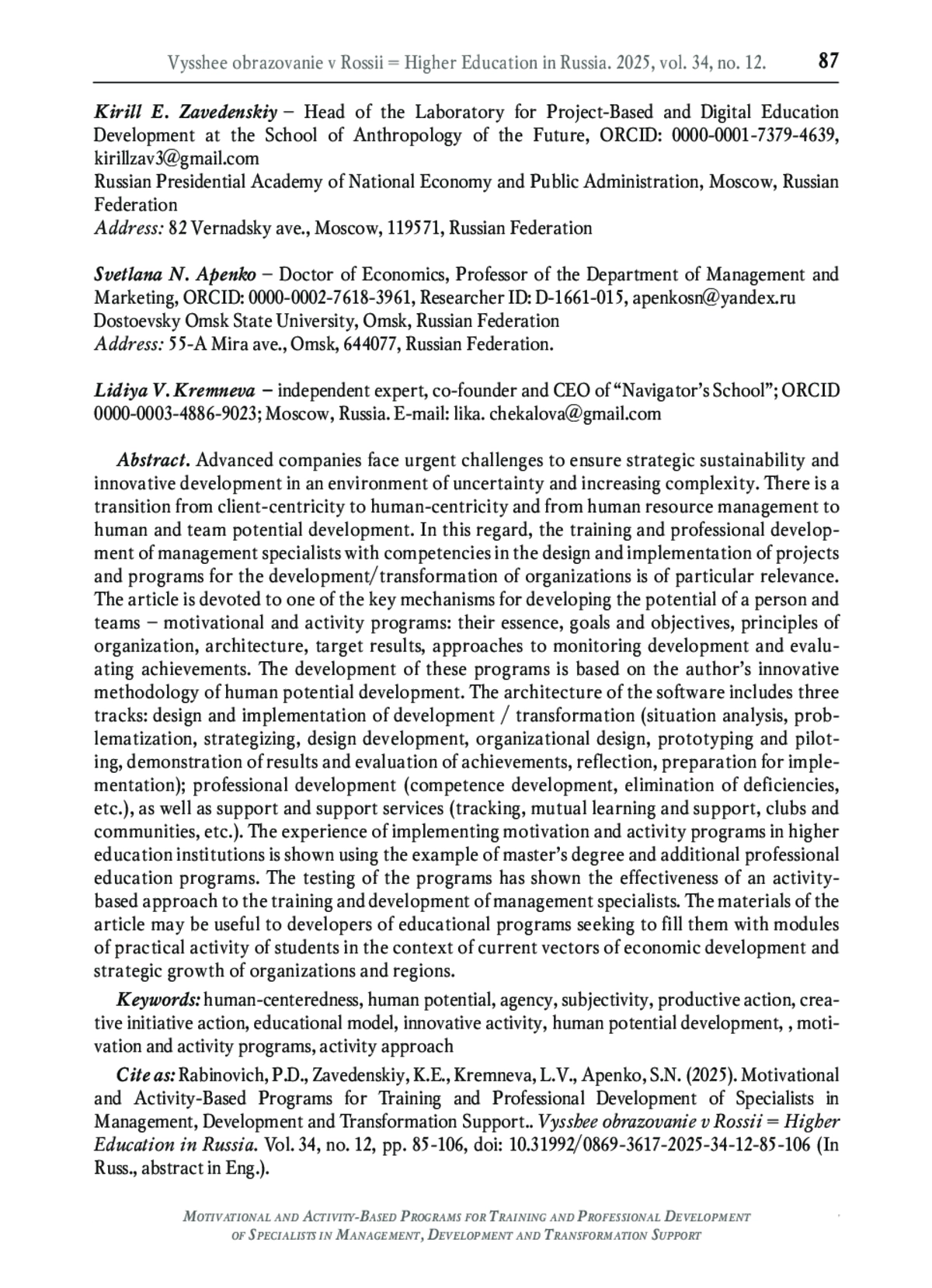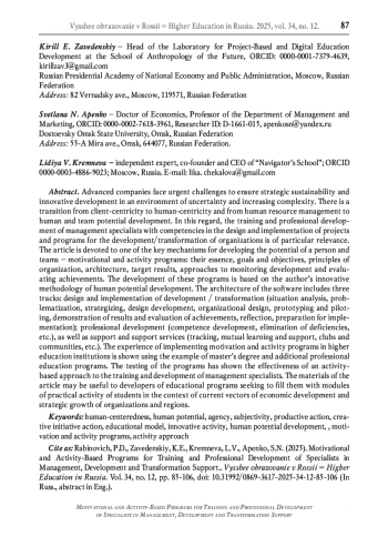 4. Рабинович П.Д., Заведенский К.Е., Лопатина Е.А., Емелин Г.Д., Долганов Д.Н. Модель потенциала человека и практики его развития // Высшее образование в России. 2024. Т. 33. № 12. С. 50-79. DOI: 10.31992/0869-3617-2021-30-12-50-79 EDN: PORHVN