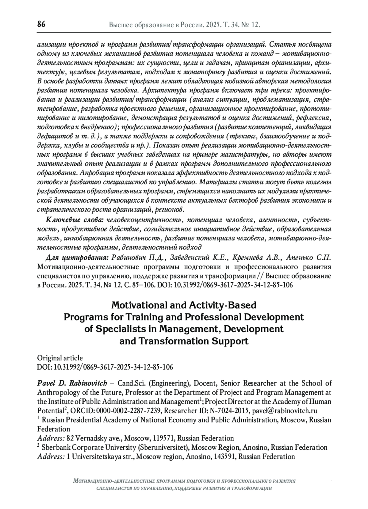 19. Рабинович П.Д., Заведенский К.Е., Лопатина Е.А., Коваль Е.Г. Модель самоопределения человека с опорой на целевой образ будущего // Образовательная политика. 2024. № 4 (100). С. 42-54. DOI: 10.15507/1991-9468.113.027.202304.591-610 EDN: AHUYDS