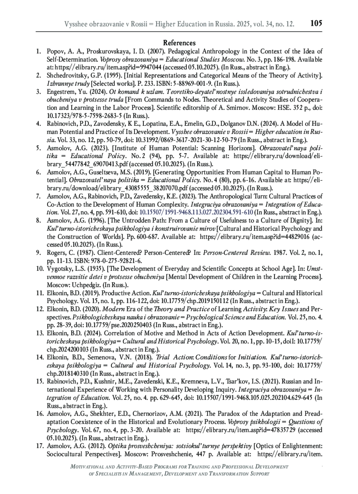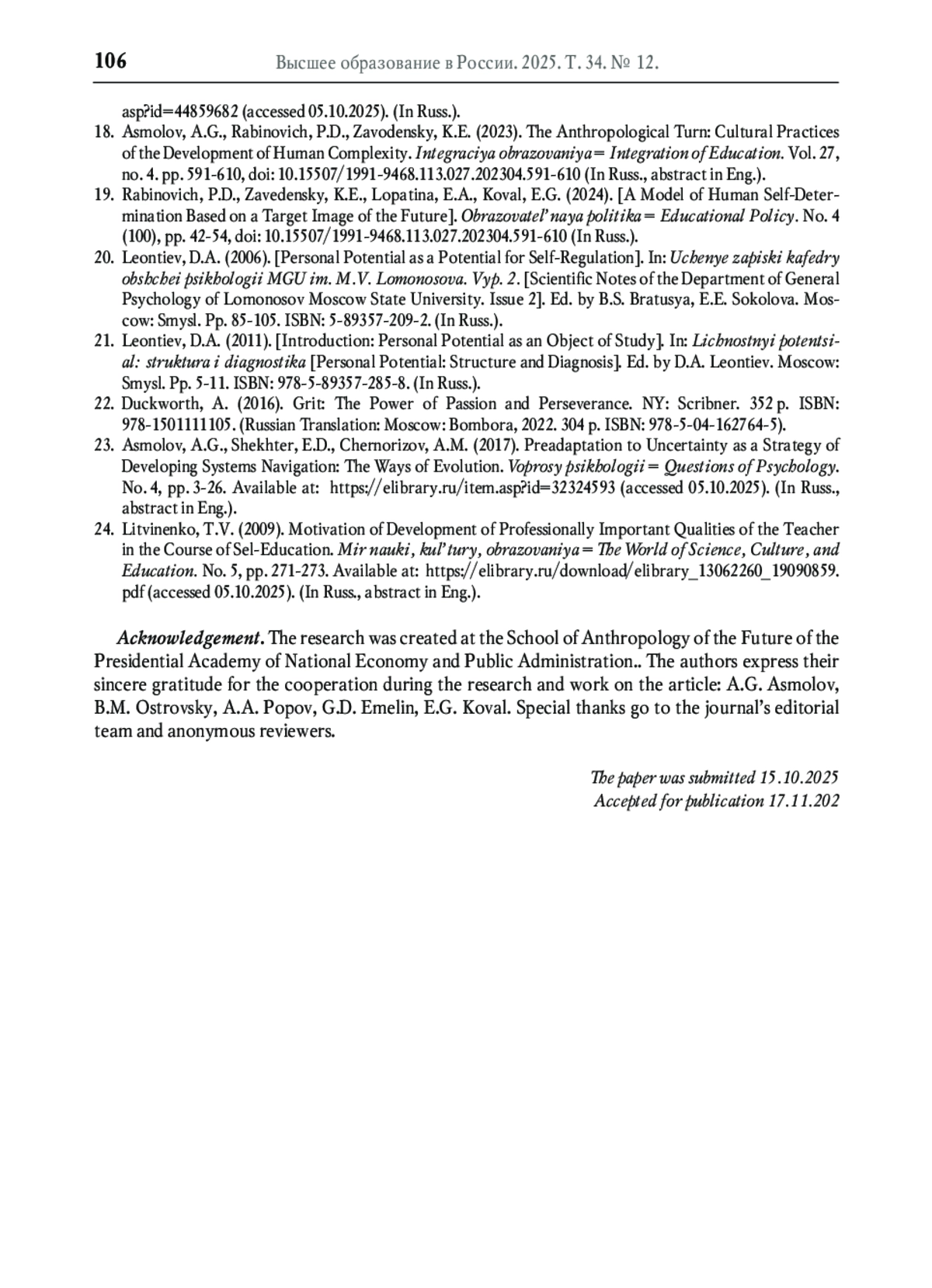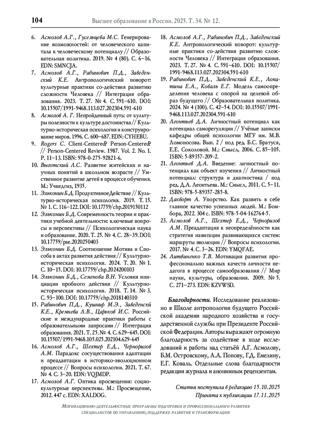 5. Асмолов А.Г. Институт потенциала человека: сканирование горизонтов // Образовательная политика. 2023. № 2 (94). С. 5-7. EDN: GEBGSA