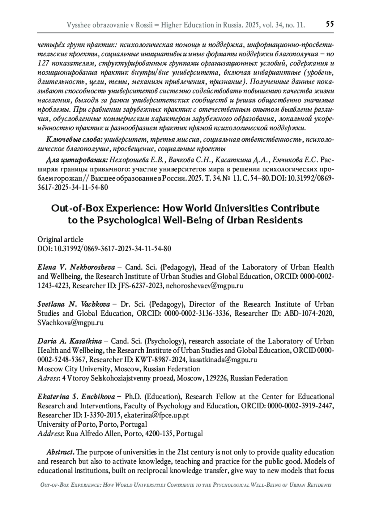 35. Шмелева Е.А., Кисляков П.А. Третья миссия университетов в институализации просоциальной активности молодёжи // Ноосферные исследования. 2021. № 2. С. 4-12. DOI: 10.46724/NOOS.2021.2.04-12 EDN: DSPNTJ