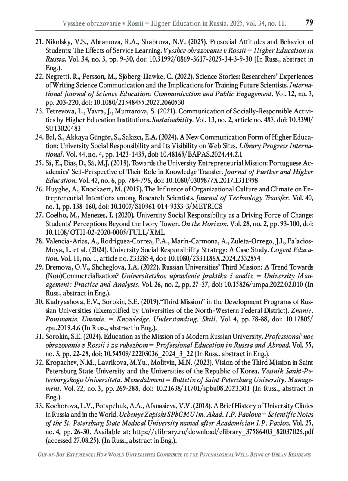 21. Никольский В.С., Амбарова П.А., Шаброва Н.В. Просоциальные установки и поведение студенческой молодёжи: эффекты обучения служением // Высшее образование в России. 2025. Т. 34. № 3. С. 9-30. DOI: 10.31992/0869-3617-2025-34-3-9-30 EDN: QPCYQZ