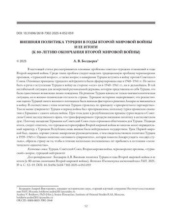 В настоящей статье рассматриваются основные проблемы советско-турецких отношений в годы Второй мировой войны. Среди таких проблем следует выделить традиционную проблему черноморских проливов, «туранский вопрос», а также вопрос о намерении Турции вступить в войну против Советского Союза. Основные принципы турецкого нейтралитета были сформулированы еще в 1940–1941 гг. Не могло быть и речи о вступлении Турции в войну на стороне «оси» ни в 1940–1941 гг., ни в дальнейшем. В той нестабильной ситуации для неокрепшей региональной державы, которую представляла из себя Турция, это была единственно возможная линия поведения. На решение Турции влияла не только внешнеполитическая ситуация, но и военно-техническая отсталость страны. Турецкие историки подчеркивают, что реалистичная оценка Турцией своего военного потенциала была важным фактором в решении Анкары не ввязываться в войну. В соответствии с этим политика Турции строилась по принципу «приоритетного партнерства». Тем не менее суверенитет Турции в период войны был прогерманским, поскольку турки проявляли симпатию к Германии с самого начала войны. При этом даже в республиканские времена турки видели в Советском Союзе наследственного врага, что трансформировало турецкую внешнюю политику в антисоветском духе. Поэтому нападение Германии на Советский Союз стало огромным облегчением для Турции. Подводя итоги, следует отметить, что турецкая историография Второй мировой войны во многом носит оправдательный характер, а Турецкая Республика лишь внешне была нейтральным государством. Урок Первой мировой был, однако, хорошо усвоен анкарскими руководителями, о чем свидетельствовала политика Турции в 1939–1945 гг. Однако политика «активного суверенитета», которая помогла Анкаре усидеть «на двух стульях», обрекла страну на то, чтобы в течение нескольких послевоенных лет пребывать в состоянии «политического одиночества».