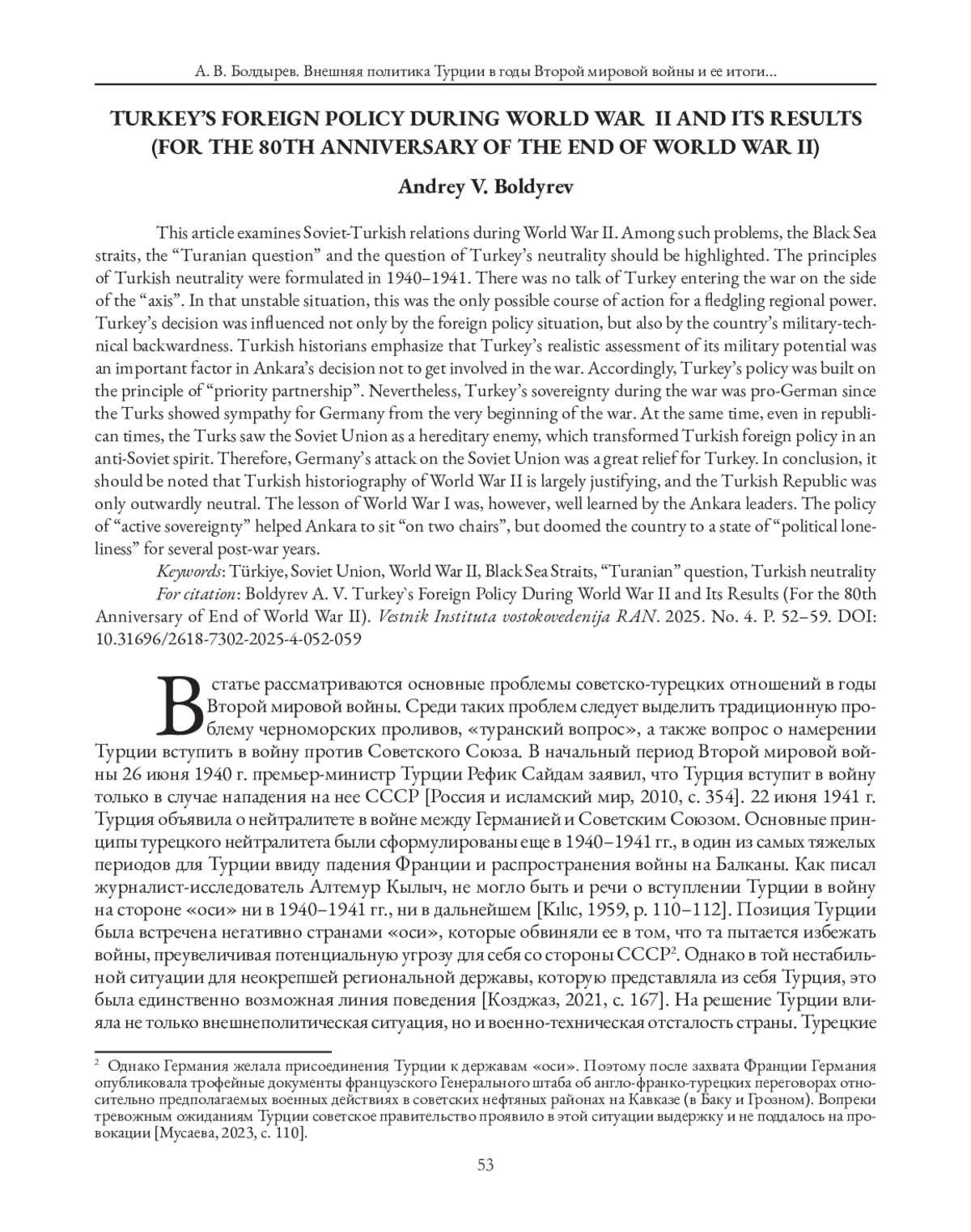 Potskhveria B. M. USSR and Türkiye during the Second World War. Russia and the Islamic World: Historical Perspective and Modern Trends. Moscow: Kraft + IV RAN, 2010. P. 354-364 (in Russian).