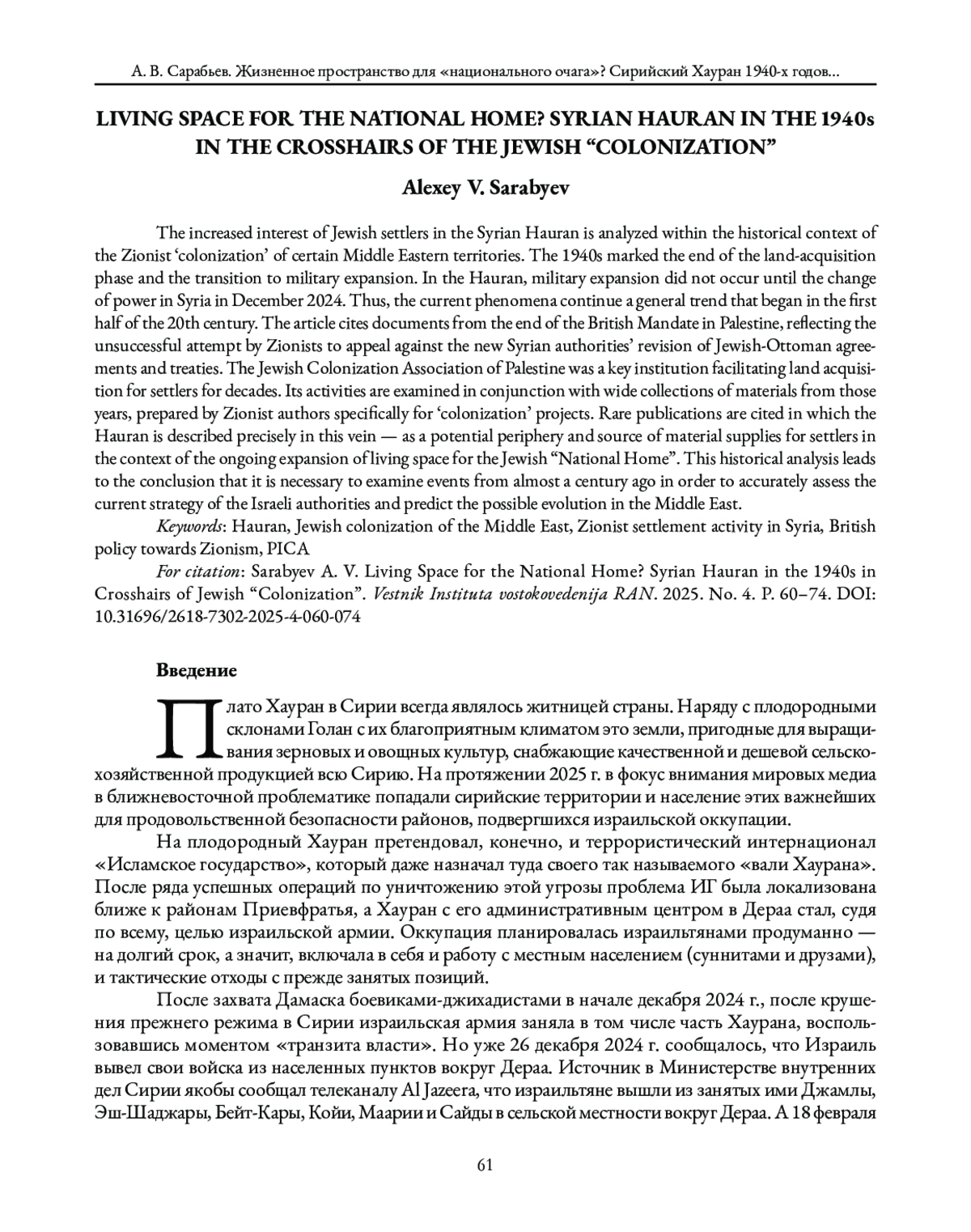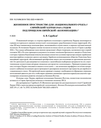 Повышенный интерес со стороны еврейских поселенцев к сирийскому Хаурану анализируется в рамках исторического явления сионистской «колонизации» ряда ближневосточных территорий. 40-е годы ХХ века ознаменовали окончание фазы, заключавшейся в скупке земель, и переход к методам военной экспансии. В отношении Хаурана силовая экспансия не велась вплоть до смены власти в Сирии в декабре 2024 г. Тем самым наблюдаемые ныне явления продолжают общую тенденцию, заложенную еще в первой половине ХХ в. В статье приводятся документы на момент окончания британского мандата в Палестине, в которых отражена безуспешная попытка апелляции сионистов в условиях пересмотра новыми сирийскими властями еврейско-османских сделок и договоров. Еврейское колонизационное общество Палестины было важнейшей структурой, обеспечивающей приобретение земель для поселенцев на протяжении десятилетий. Его деятельность рассматривается в комплексе с масштабными подборками материалов тех лет, подготовленными сионистскими авторами специально для проектов «колонизации». Приводятся редкие издания, в которых Хауран описывается именно в этом ключе — как возможная периферия и источник материального снабжения поселенцев в русле проводимого расширения жизненного пространства для еврейского «национального очага». Исторический анализ приводит к выводу о необходимости обращения к явлениям почти вековой давности для того, чтобы верно оценивать нынешнюю стратегию израильских властей и прогнозировать возможное развитие ситуации на Ближнем Востоке.