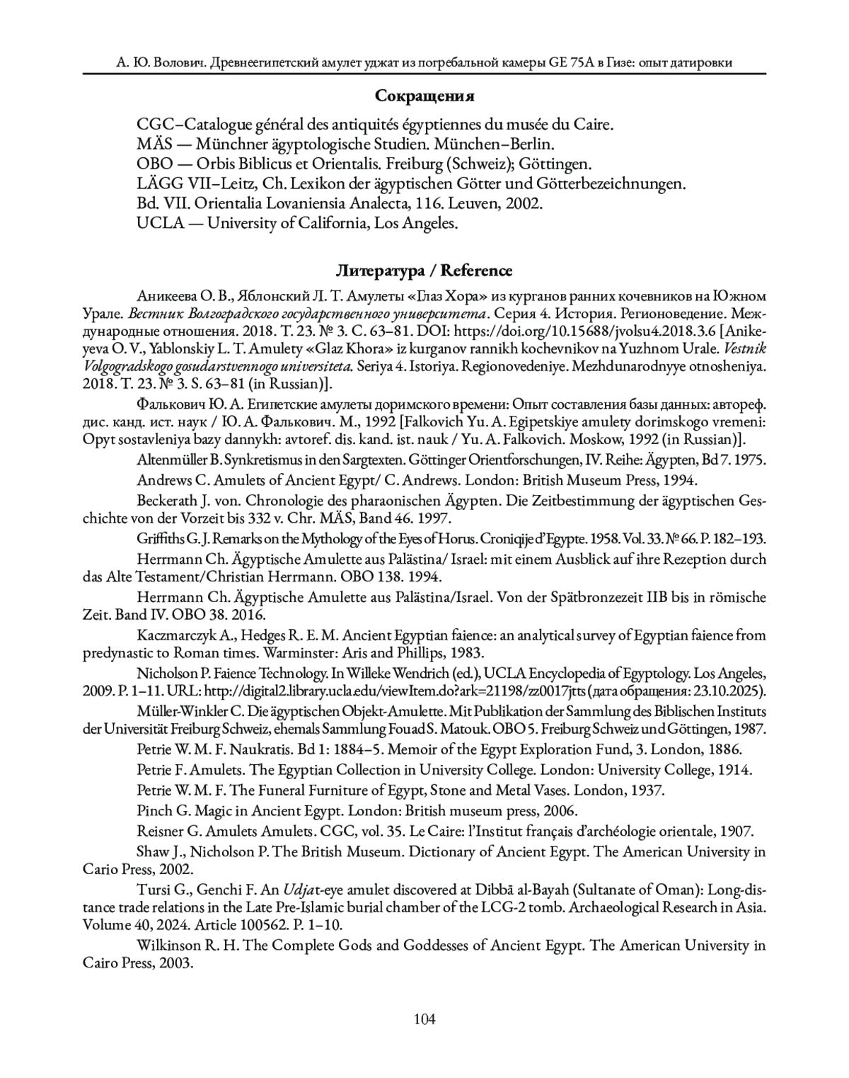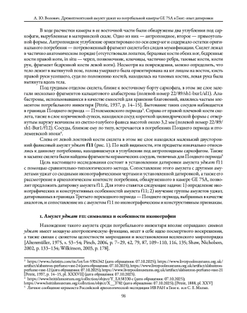 1. Аникеева О. В., Яблонский Л. Т. Амулеты “Глаз Хора” из курганов ранних кочевников на Южном Урале. Вестник Волгоградского государственного университета. Серия 4. История. Регионоведение. Международные отношения. 2018. Т. 23. № 3. С. 63-81. DOI: 10.15688/jvolsu4.2018.3.6