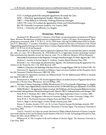 2. Фалькович Ю. А. Египетские амулеты доримского времени: Опыт составления базы данных: автореф. дис. канд. ист. наук / Ю. А. Фалькович. М., 1992.