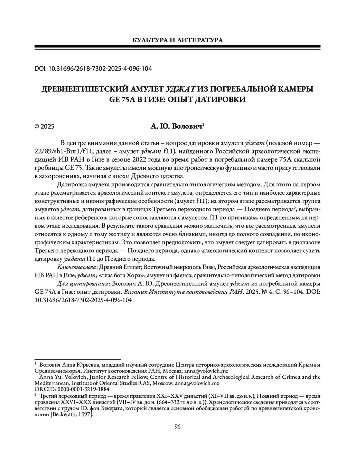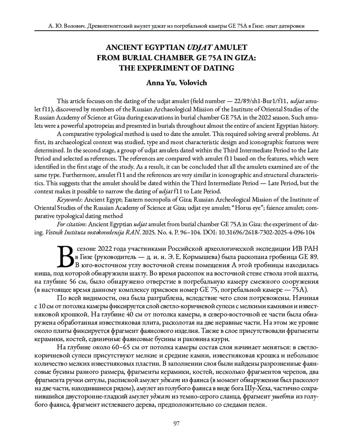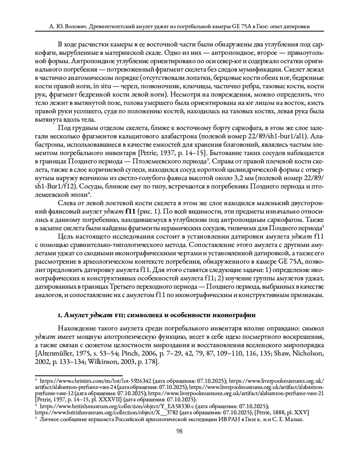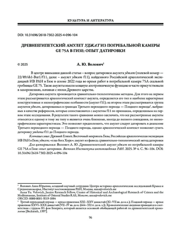 В центре внимания данной статьи – вопрос датировки амулета уджат (полевой номер — 22/89/sh1-Bur1/f11, далее – амулет уджат f11), найденного Российской археологической экспедицией ИВ РАН в Гизе в сезоне 2022 года во время работ в погребальной камере 75А скальной гробницы GE 75. Такие амулеты имели мощную апотропеическую функцию и часто присутствовали в захоронениях, начиная с эпохи Древнего царства.