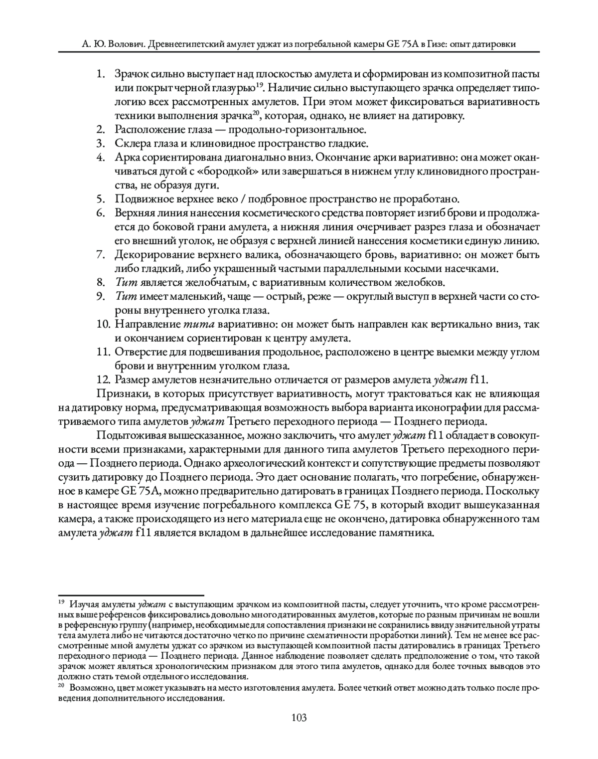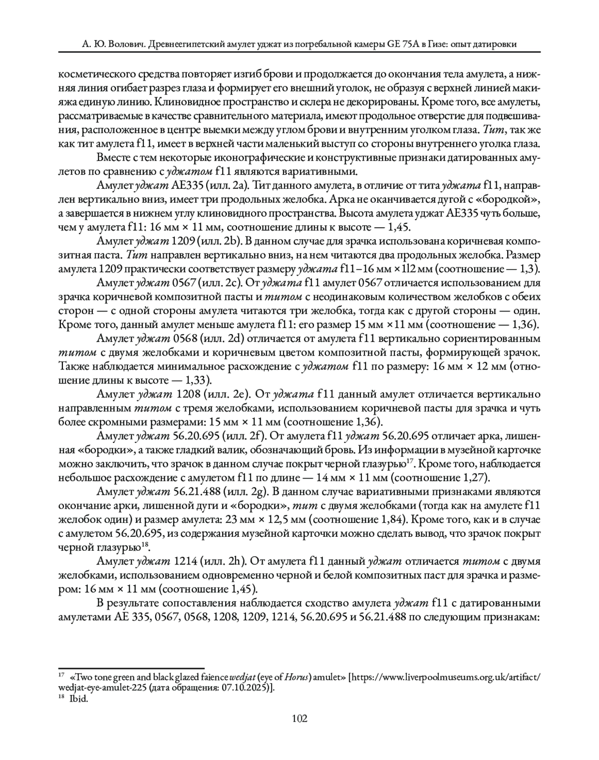 Датировка амулета производится сравнительно-типологическим методом. Для этого на первом этапе рассматривается археологический контекст амулета, определяется его тип и наиболее характерные конструктивные и иконографические особенности (амулет f11); на втором этапе рассматривается группа амулетов уджат, датированных в границах Третьего переходного периода — Позднего периода2, выбранных в качестве референсов, которые сопоставляются с амулетом f11 по признакам, определенным на первом этапе исследования. В результате такого сравнения можно заключить, что все рассмотренные амулеты относятся к одному и тому же типу и являются очень близкими, иногда до полного совпадения, по иконографическим характеристикам. Это позволяет предположить, что амулет следует датировать в диапазоне Третьего переходного периода — Позднего периода, однако археологический контекст позволяет сузить датировку уждата f11 до Позднего периода.