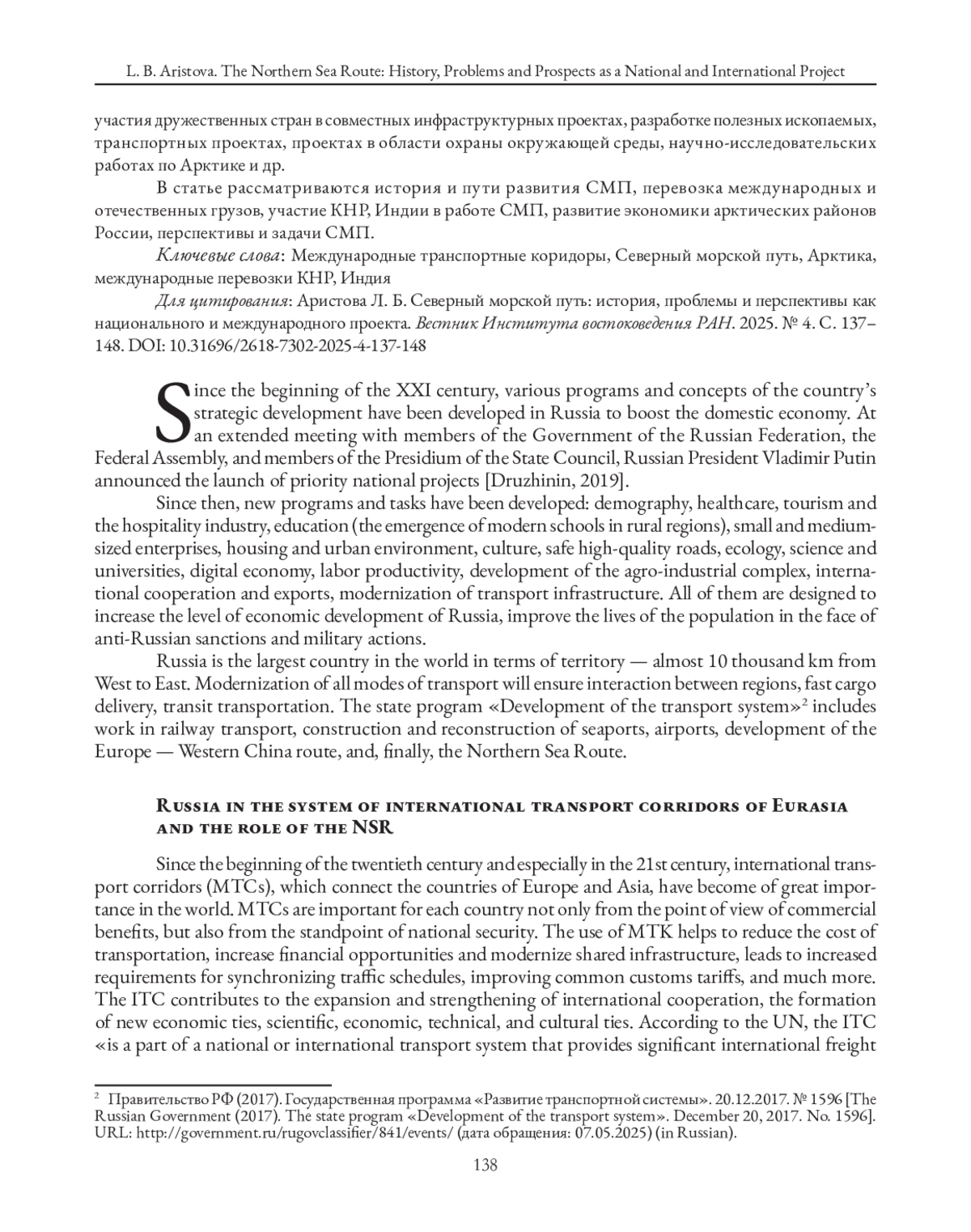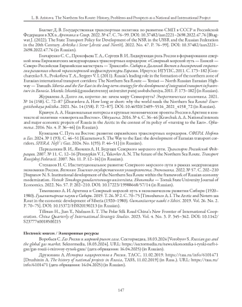 2. Бхагват Д. В. Государственная транспортная политика по развитию СМП в СССР и Российской Федерации в XX в. Арктика и Север. 2022. № 47. С. 76-99. DOI: 10.37482/issn2221-2698.2022.47.76 EDN: KSSGUJ