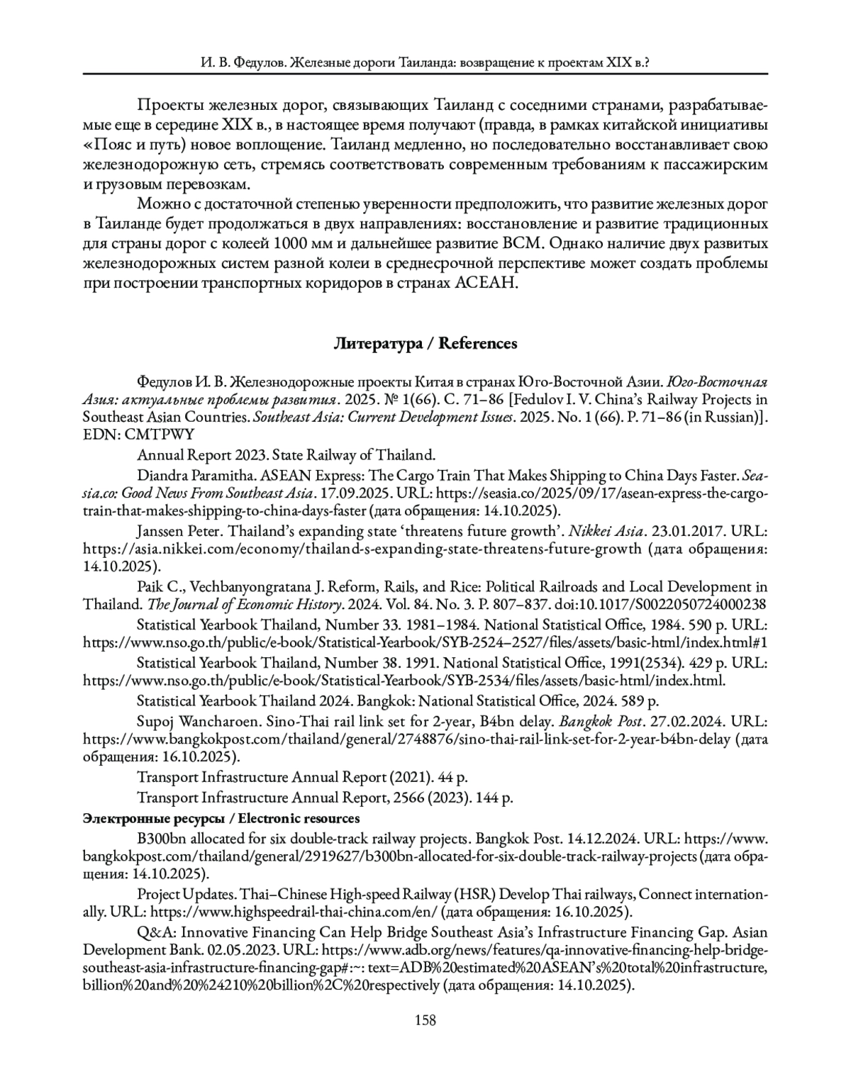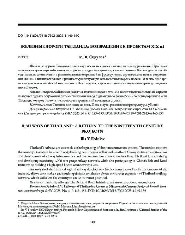 1. Федулов И. В. Железнодорожные проекты Китая в странах Юго-Восточной Азии. Юго-Восточная Азия: актуальные проблемы развития. 2025. № 1(66). С. 71-86.