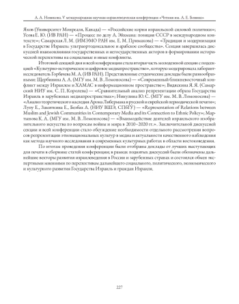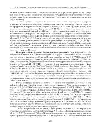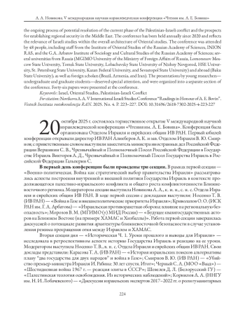 В данной статье представлен обзор V международной научной израилеведческой конференции «Чтения им. А. Е. Бовина», которая состоялась 20–23 октября 2025 г. в смешанном очно-дистанционном формате. Данное научное мероприятие проводится на базе Института востоковедения РАН и организовано сотрудниками Отдела Израиля и еврейских общин (зав. отделом В. Ю. Смирновым, с. н. с. А. А. Новиковой, н. с. Е. А. Якимовой, лаб.-исслед. М. А. Горбачевой). Данная конференция посвящена продолжающемуся процессу потенциального урегулирования текущей фазы палестино-израильского конфликта и перспективам установления региональной безопасности на Ближнем Востоке. Конференция «Чтения им. А. Е. Бовина» проводится ежегодно с 2020 г. и отражает актуальность исследований израилеведения в общей архитектуре востоковедения. В работе конференции приняли участие 48 человек, включая сотрудников Института востоковедения РАН, ИНИОН РАН, ИСК РАН им. Г. А. Арбатова; ряда вузов России (МГИМО (у) МИД России, МГУ им. М. В. Ломоносова, ТомГУ, ННГУ им. Н. И. Лобачевского, НИУ ВШЭ, СПбГУ, КФУ, Севастопольский ГУ) и зарубежных стран (БГУ), а также зарубежные ученые (Бразилия, Армения, Иран). Отдельного внимания заслуживают выступления молодых исследователей — студентов и аспирантов, выделенных в отдельную секцию конференции. На конференции было представлено 46 докладов.
