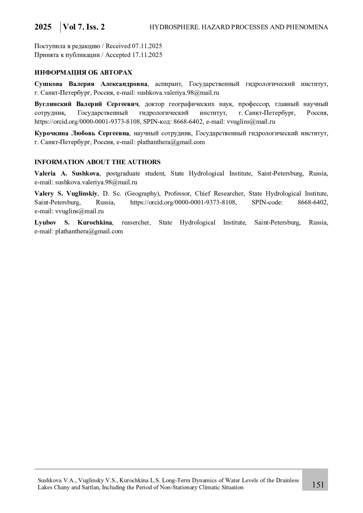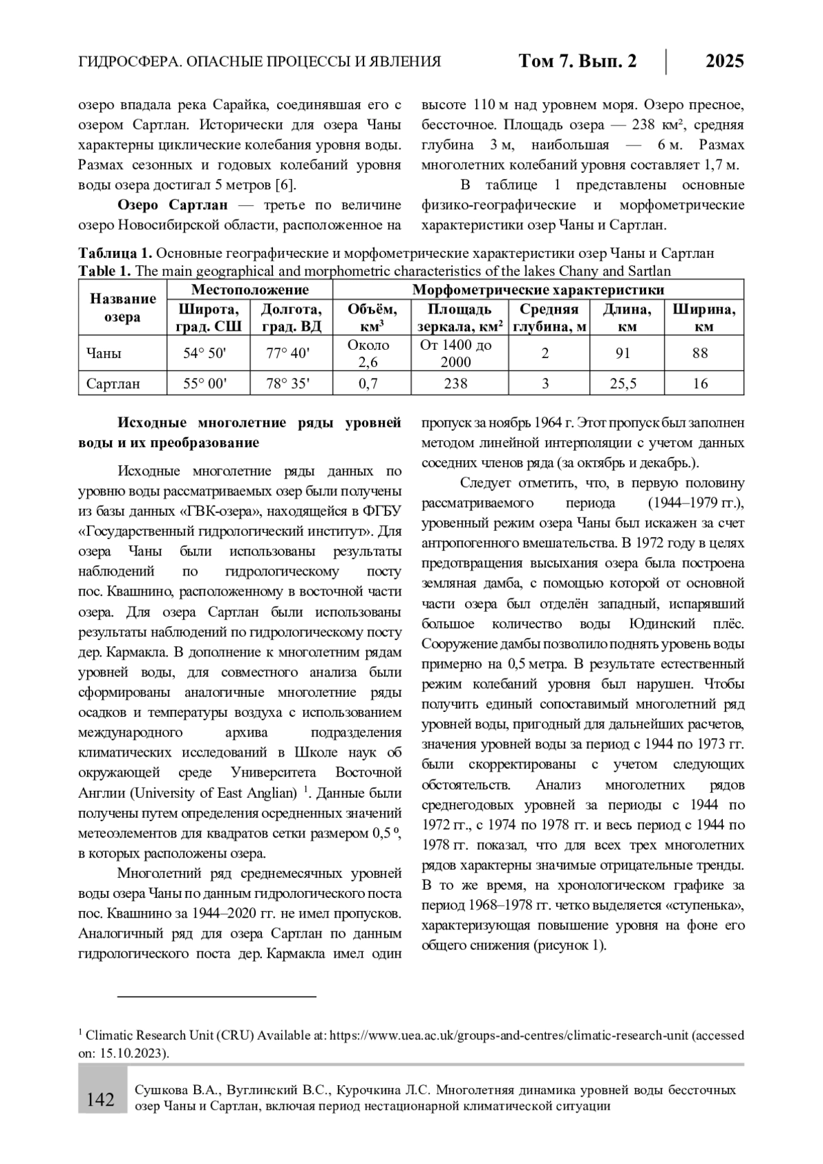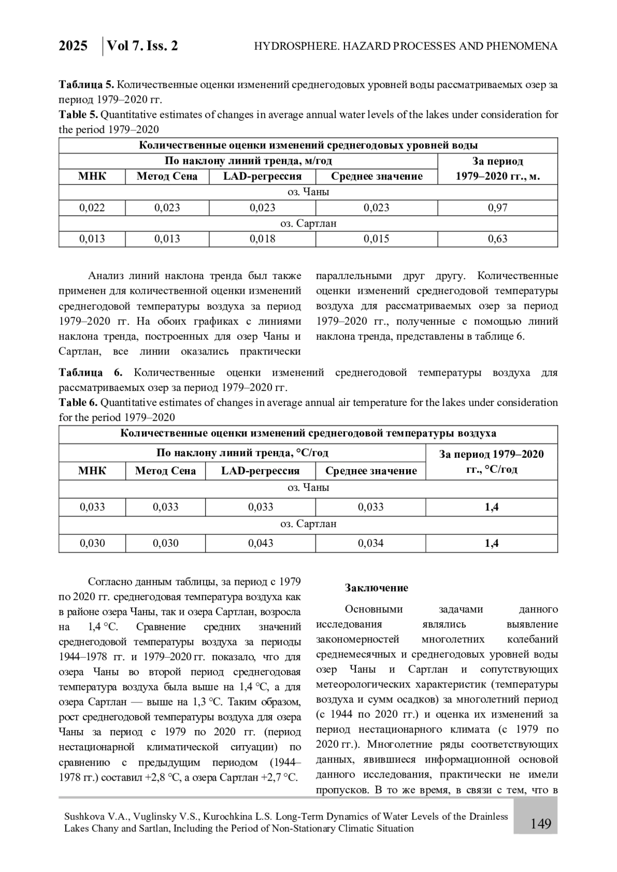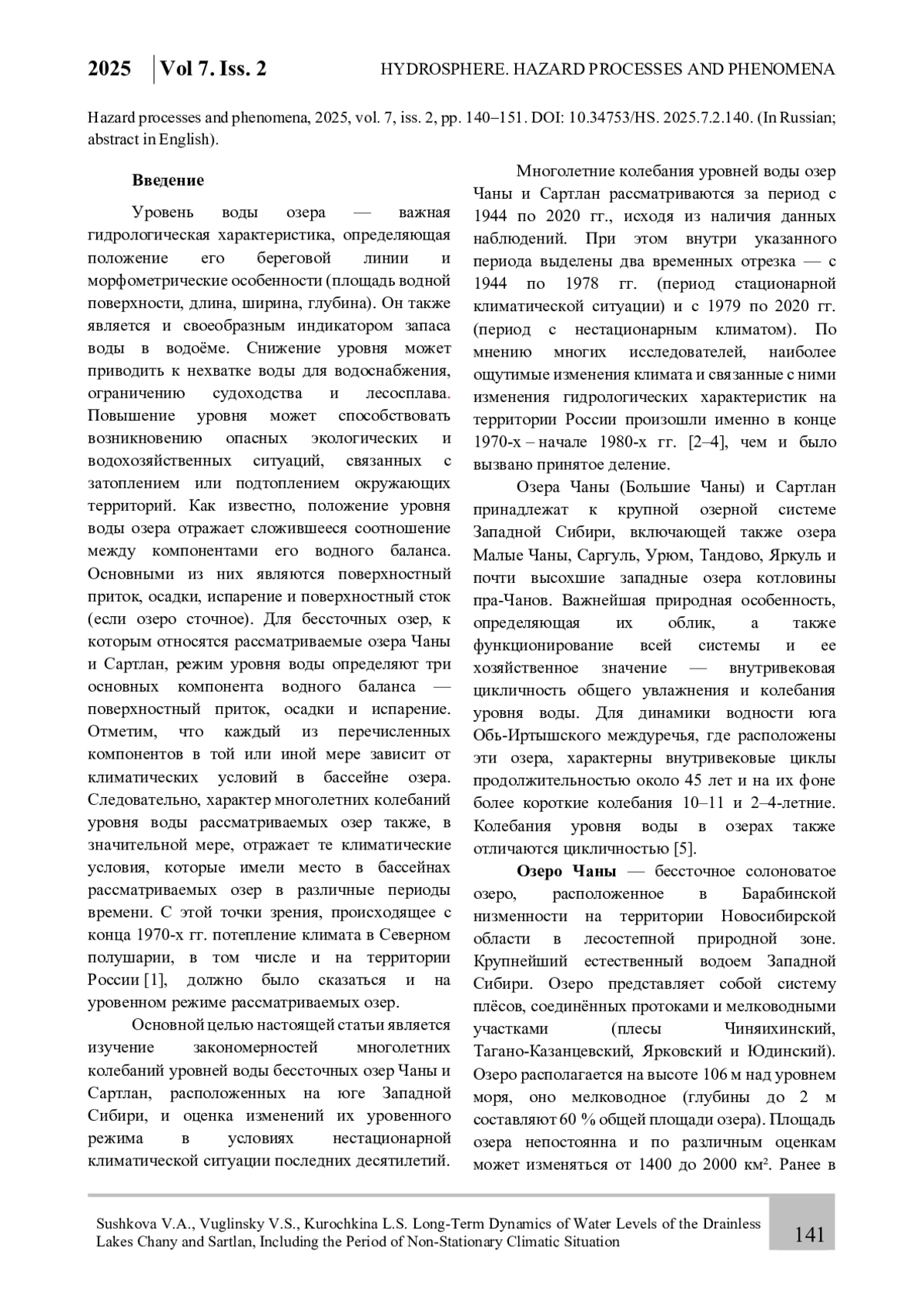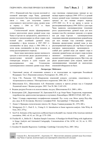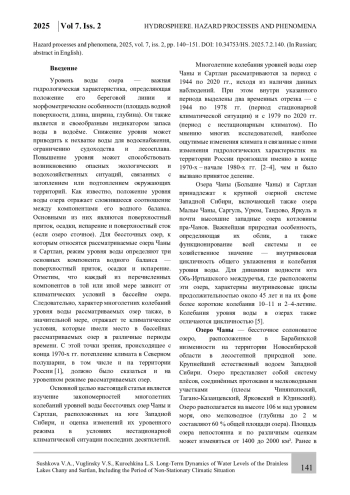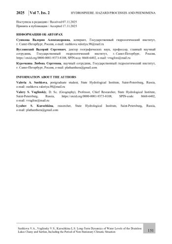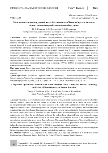 Статья посвящена изучению закономерностей многолетних колебаний уровней воды бессточных озер Чаны и Сартлан, расположенных на юге Западной Сибири. Как известно, уровень воды является интегральным показателем состояния водных ресурсов водоема, и изучение его динамики является важной научной задачей, позволяющей предсказать и смягчить неблагоприятные водохозяйственные и экологические ситуации, возникающие как при резком снижении (осушение береговой террасы), так и резком повышении (затопление прибрежных территорий) уровней озер. На основании данных стандартных гидрометеорологических наблюдений и их корректировки, и использования климатических архивов, получены расчетные многолетние ряды среднегодовых и среднемесячных значений уровней воды рассматриваемых озер, а также температуры воздуха и сумм осадков в районах их расположения. Выявлены закономерности многолетних колебаний указанных характеристик за период с 1944 по 2020 гг. и дана количественная оценка изменений уровней озер за период c 1979 по 2020 гг. в условиях нестационарной климатической ситуации