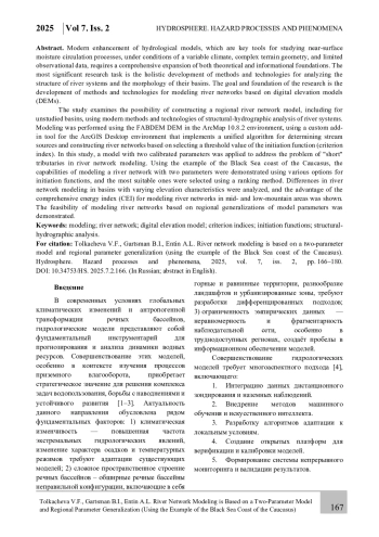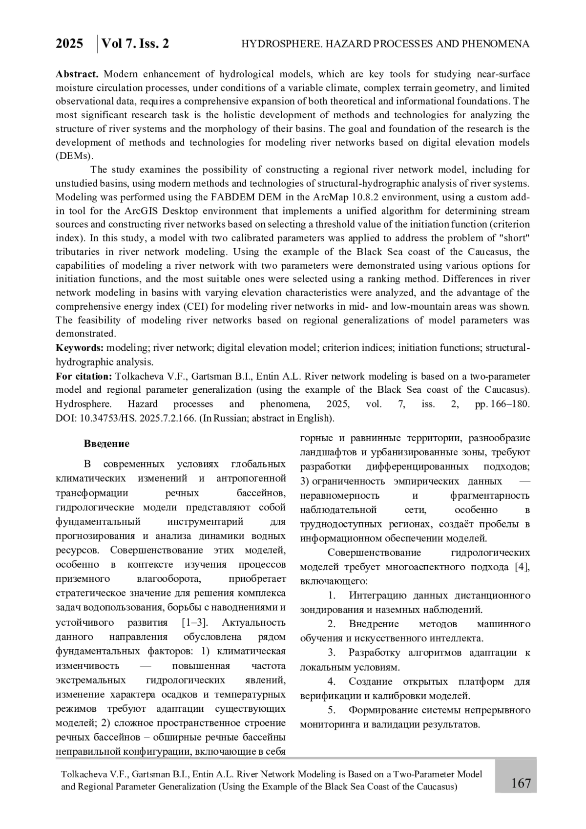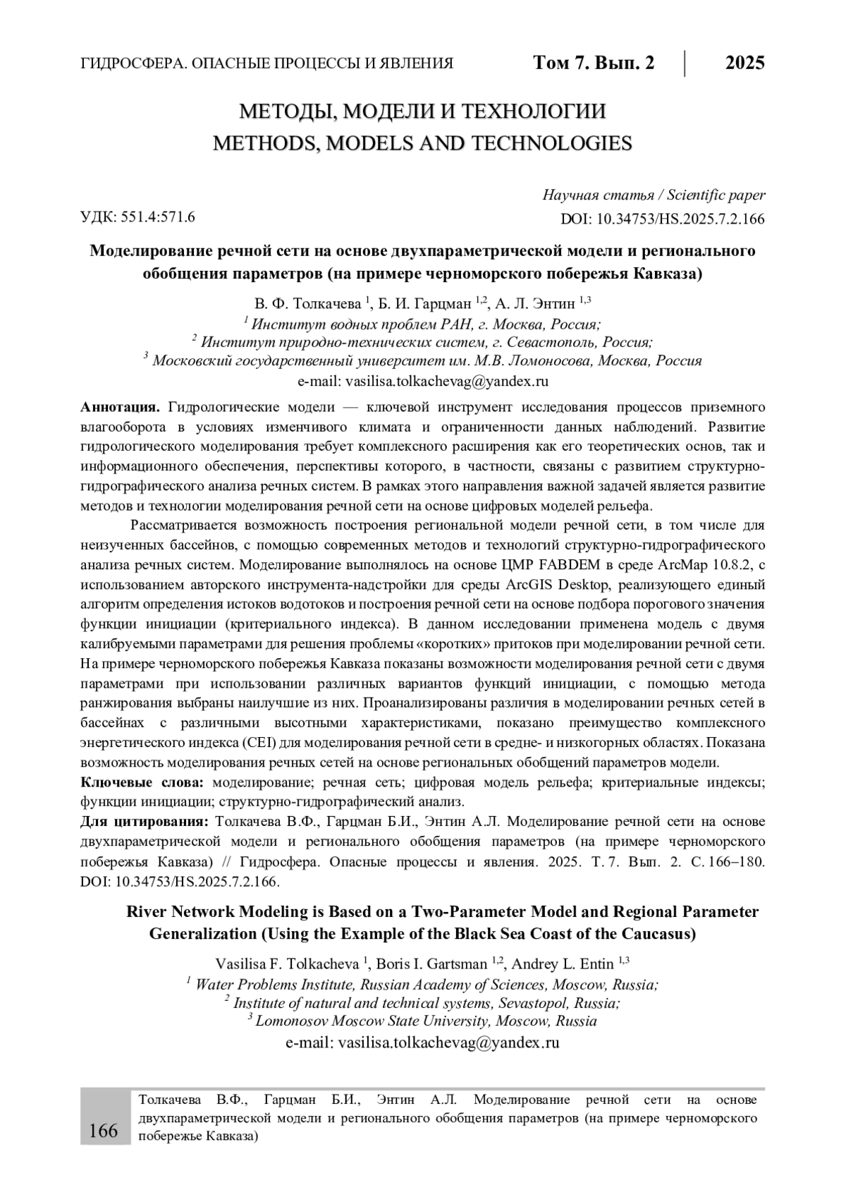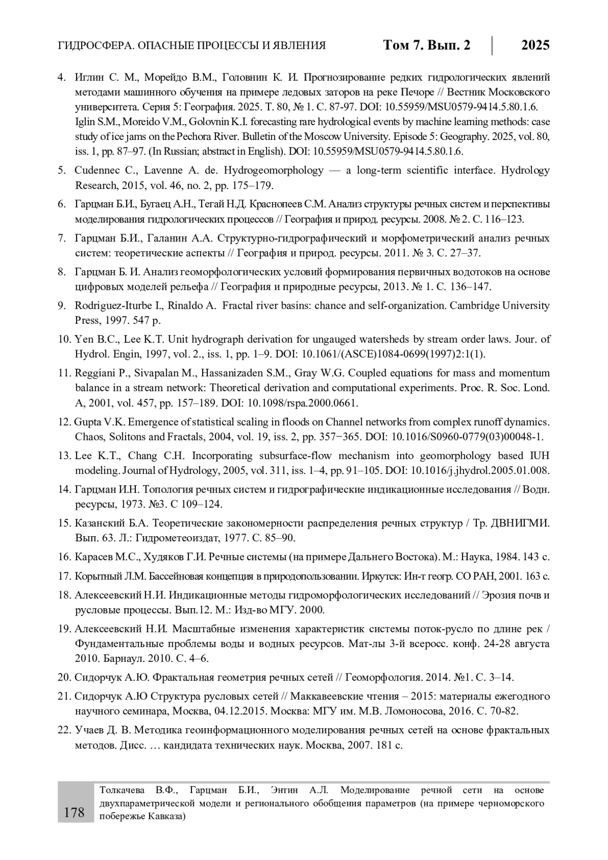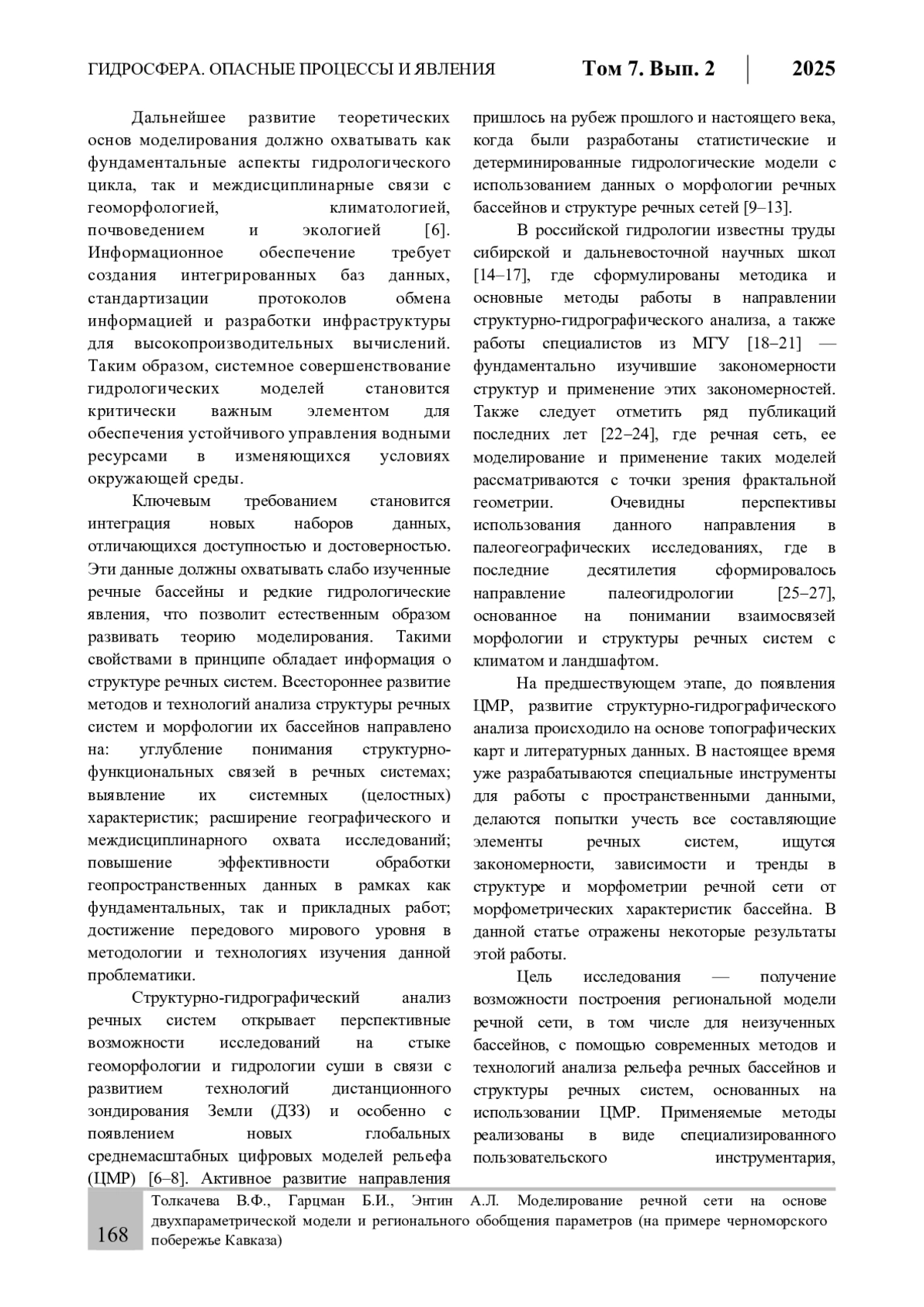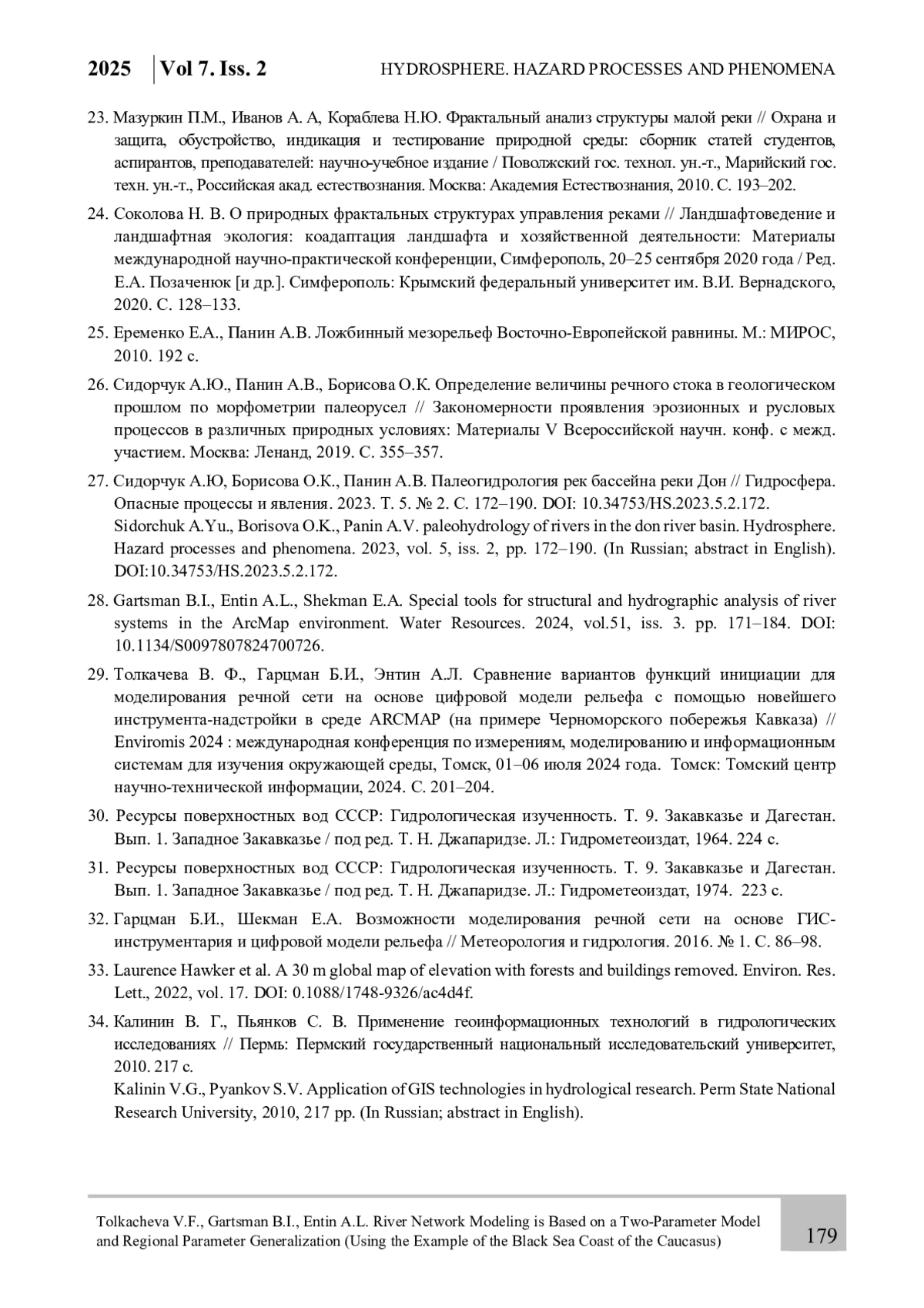 35. Толкачева В. Ф., Гарцман Б.И., Энтин А.Л. Моделирование речной сети на основе цифровой модели рельефа: проблема “коротких” притоков // Гидросфера. Опасные процессы и явления. 2024. Т. 6, № 2. С. 110-124. DOI: 10.34753/HS.2024.6.2.110