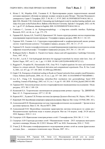 6. Гарцман Б.И., Бугаец А.Н., Тегай Н.Д. Краснопеев С.М. Анализ структуры речных систем и перспективы моделирования гидрологических процессов // География и природ. ресурсы. 2008. № 2. С. 116-123.