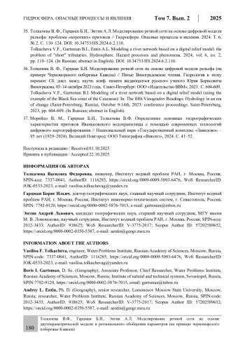 36. Толкачева В. Ф., Гарцман Б.И. Моделирование речной сети на основе цифровой модели рельефа (на примере Черноморского побережья Кавказа) // Пятые Виноградовские чтения. Гидрология в эпоху перемен: Сб. докл. межд. научн. конф. памяти выдающегося русского ученого Юрия Борисовича Виноградова, 05-14 октября 2023 года. Санкт-Петербург: ООО “Издательство ВВМ”, 2023. С. 604-609. Tolkacheva V.F., Gartsman B.I. Modeling of a river network based on a digital relief model (using the example of the Black Sea coast of the Caucasus)/ In: The fifth Vinogradov Readings. Hydrology in an era of change (Saint-Petersburg, Russia), October 9-14th, 2023: conference proceedings. Saint-Petersburg, 2023, pp. 604-609. (In Russian; abstract in English).