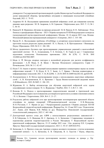 В качестве альтернативы рассмотрено применение нейросетевых моделей, способных учитывать нелинейные взаимосвязи. Нейросети продемонстрировали высокую точность прогнозирования с погрешностью 5 см для максимальных уровней воды. Их ключевые преимущества включают адаптивность к новым данным и устойчивость к аномальным условиям.