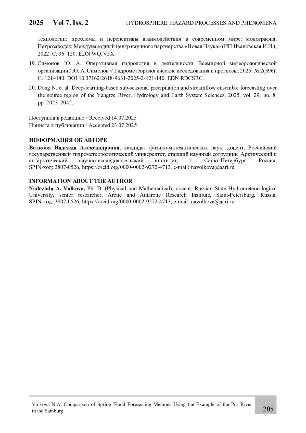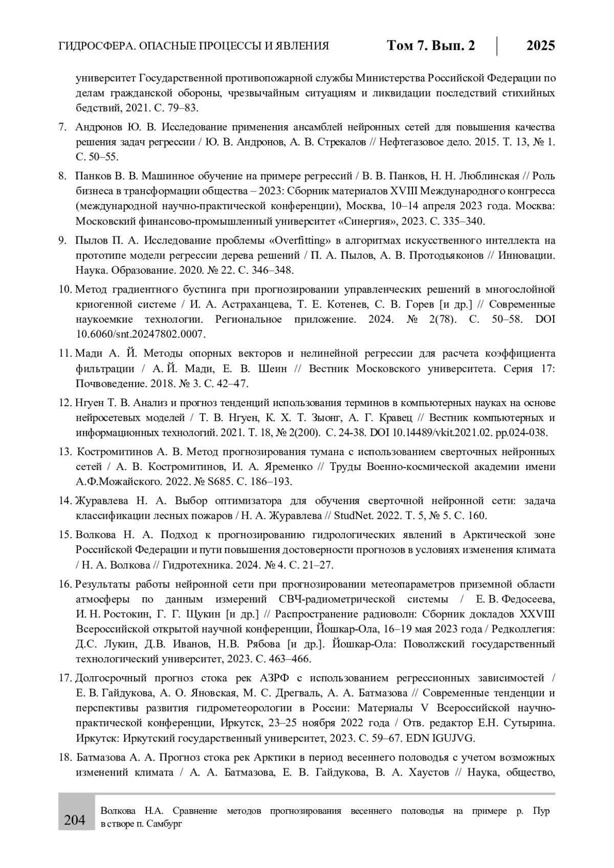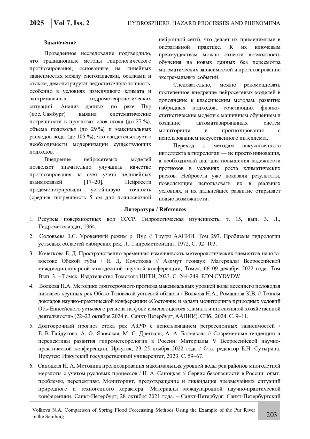 15. Волкова Н. А. Подход к прогнозированию гидрологических явлений в Арктической зоне Российской Федерации и пути повышения достоверности прогнозов в условиях изменения климата / Н. А. Волкова // Гидротехника. 2024. № 4. С. 21-27.