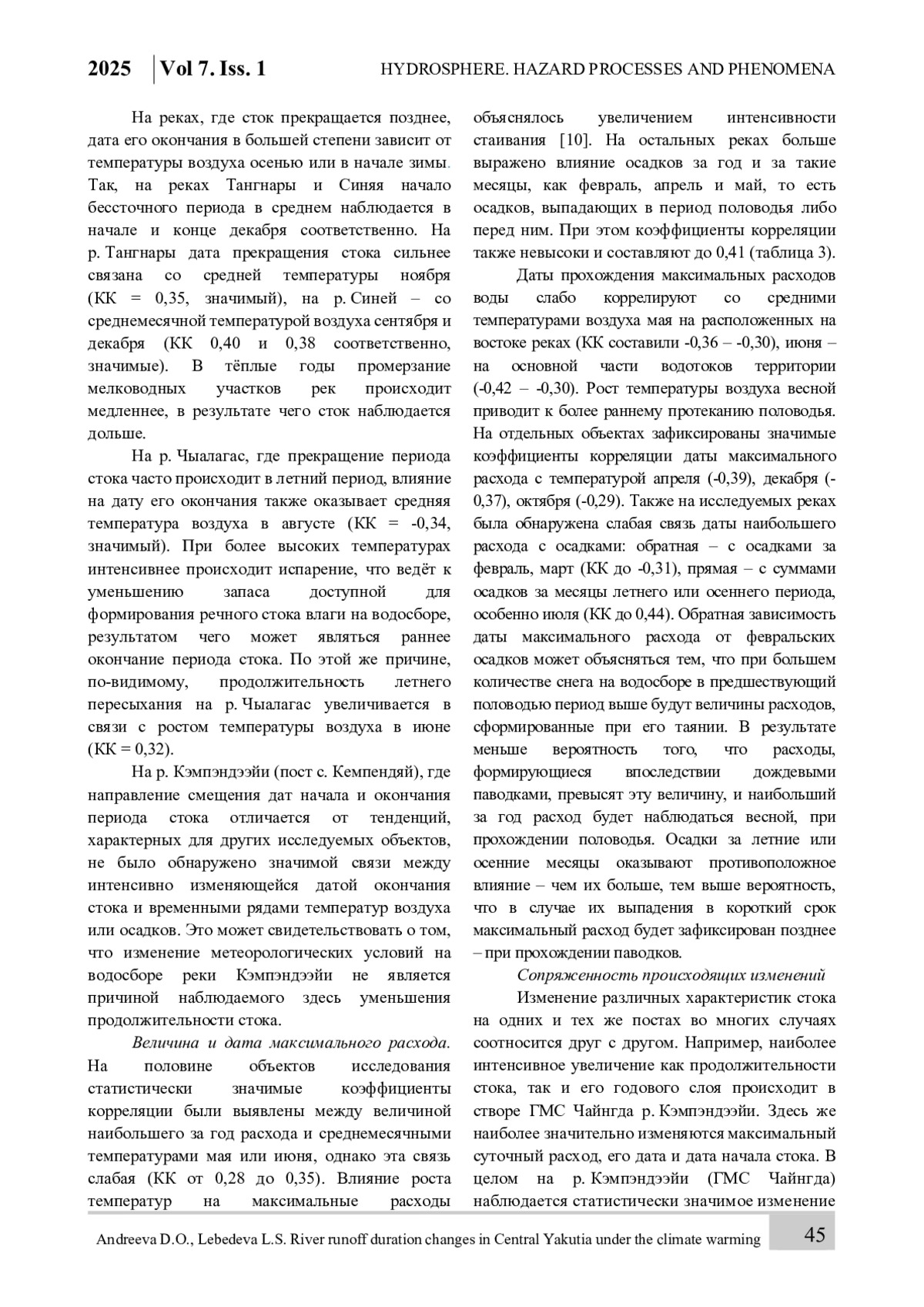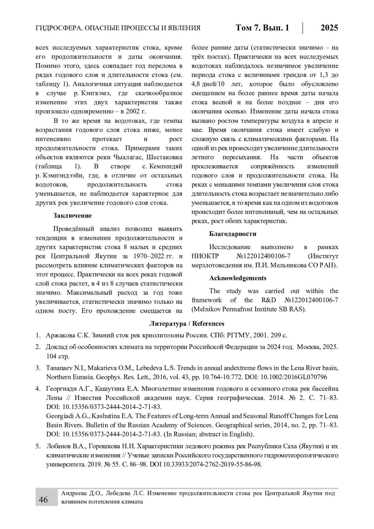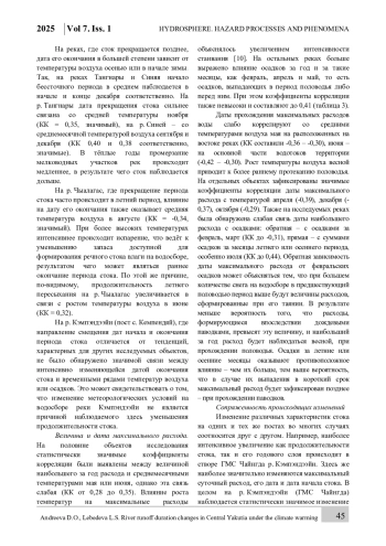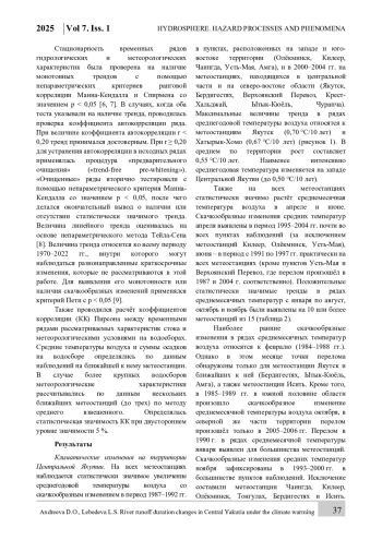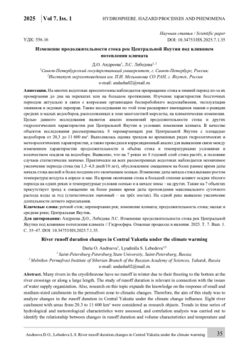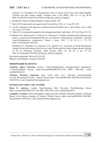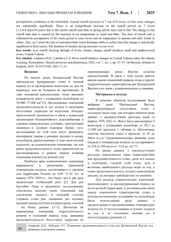 На многих водотоках криолитозоны наблюдается прекращение стока в зимний период из-за их промерзания до дна на перекатах или на большом протяжении. Изучение характеристик бессточных периодов актуально в связи с вопросами организации бесперебойного водоснабжения, эксплуатации зимников и ледовых переправ. Также исследования по этой теме расширяют имеющиеся знания о реакции средних и малых водосборов, расположенных в зоне многолетней мерзлоты, на климатические изменения. Целью данного исследования является анализ изменений продолжительности стока и других гидрологических характеристик рек Центральной Якутии в условиях изменения климата. В качестве объектов исследования рассматривались 8 перемерзающих рек Центральной Якутии с площадью водосборов от 20,3 до 11 600 км². Выполнялась оценка трендов во временных рядах гидрологических и метеорологических характеристик, а также проводился корреляционный анализ для выявления связи между изменением характеристик продолжительности и объёма стока и температурными условиями и количеством осадков на водосборе. Выявлено, что на 7 реках из 8 годовой слой стока растёт, в половине случаев статистически значимо. Практически на всех рассмотренных водотоках наблюдается незначимое увеличение периода стока (на 1,3–4,8 дней/10 лет), обусловленное смещением на более раннее время даты начала стока весной и более поздним его окончанием осенью. Изменение даты начала стока вызвано ростом температуры воздуха в апреле и мае. На время окончания стока в большей степени влияют осадки тёплого периода на одних реках и температурные условия осенью и в начале зимы – на других. Также на 7 объектах присутствует тренд к смещению на более раннее время даты прохождения максимального суточного расхода воды за год (статистически значимый – на трёх постах). На одной реке выявлено увеличение длительности летнего пересыхания.