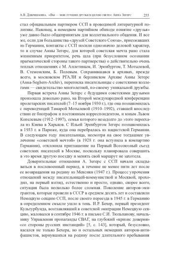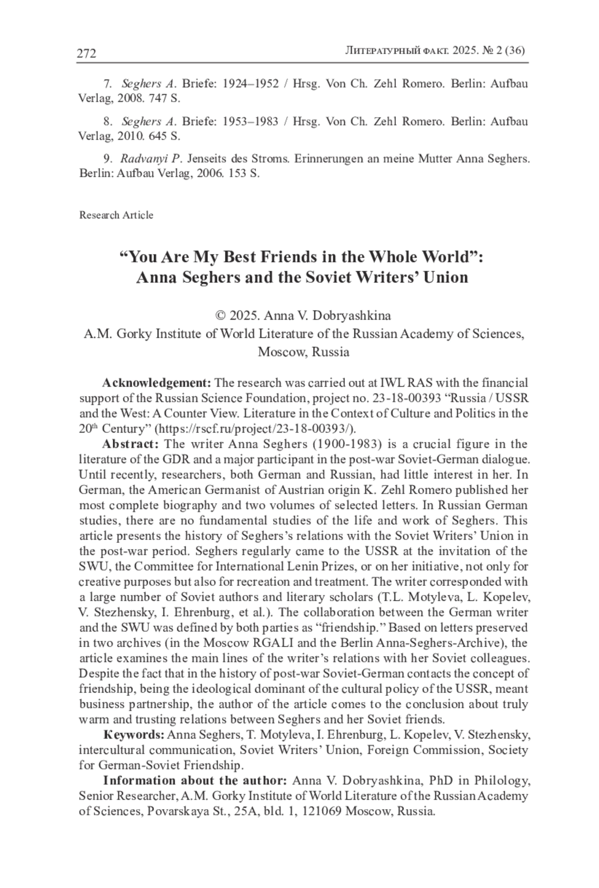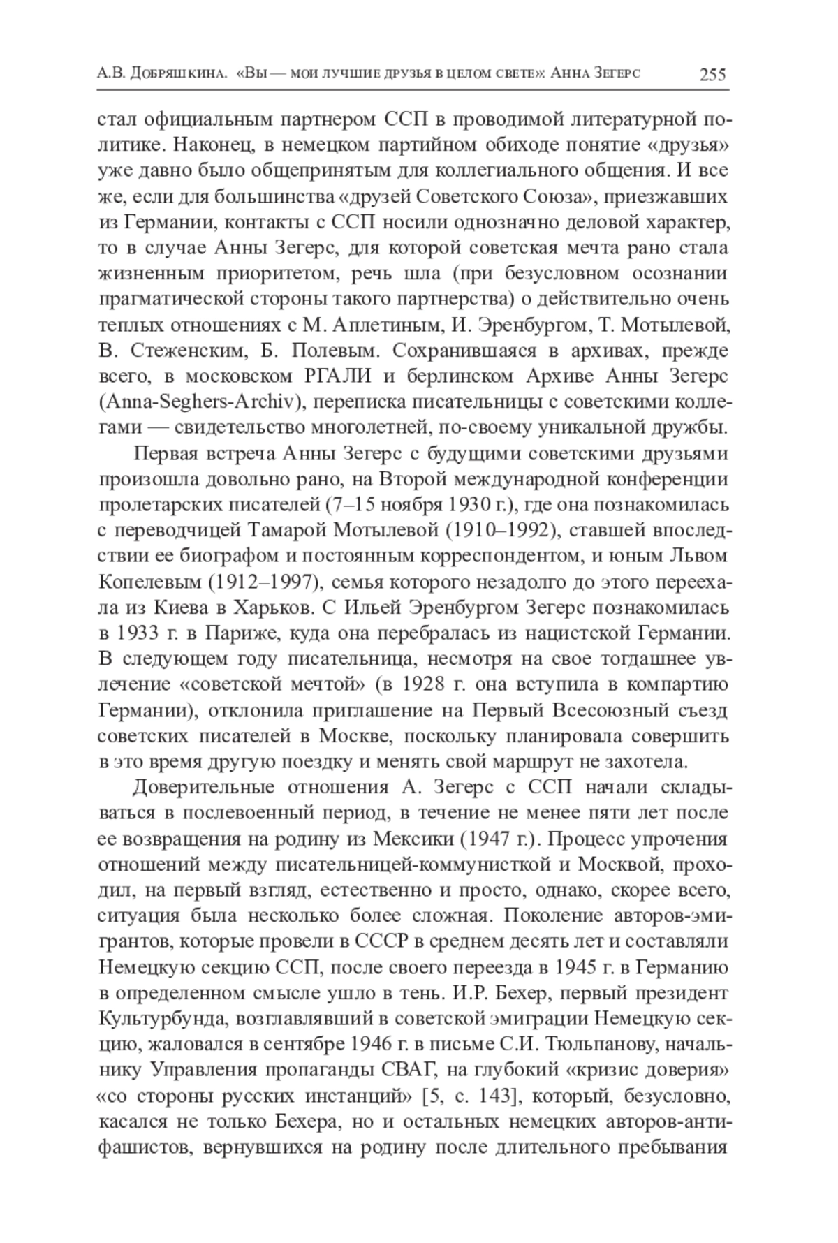6. Седельник В.Д. Анна Зегерс и русские (советские) писатели // Россия - Германия: литературные встречи (1880-1945) / отв. ред. Т.В. Кудрявцева. М.: ИМЛИ РАН, 2017. С. 451-469. EDN: ZQOOSR