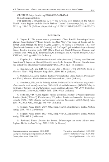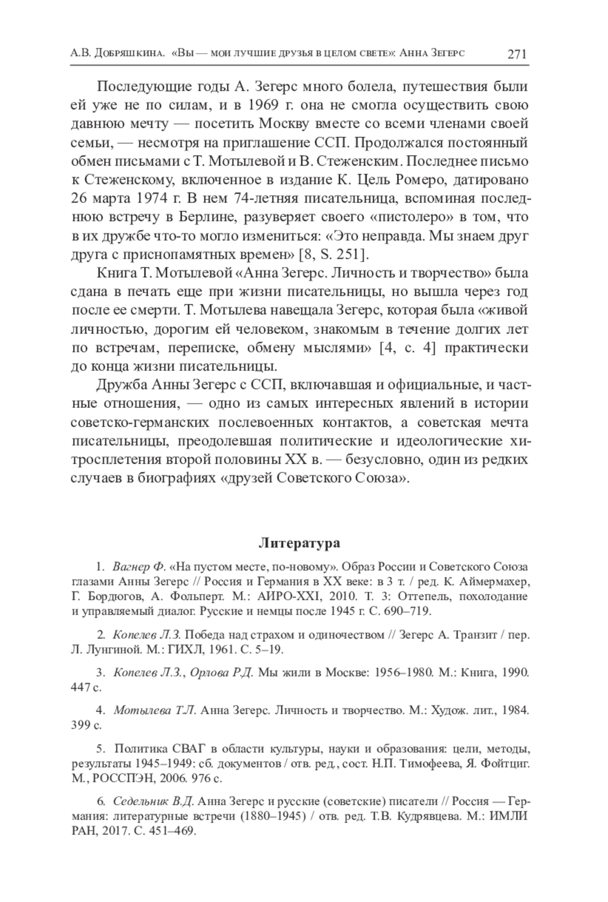 1. Вагнер Ф. “На пустом месте, по-новому”. Образ России и Советского Союза глазами Анны Зегерс // Россия и Германия в ХХ веке: в 3 т. / ред. К. Аймермахер, Г. Бордюгов, А. Фольперт. М.: АИРО-XXI, 2010. Т. 3: Оттепель, похолодание и управляемый диалог. Русские и немцы после 1945 г. С. 690-719.
