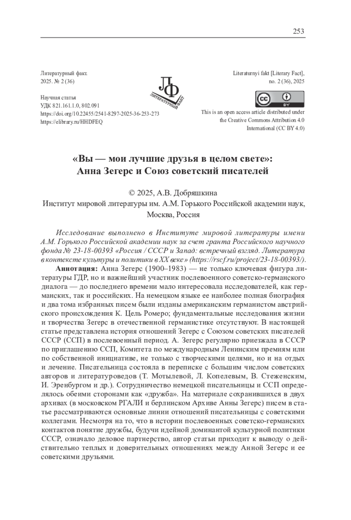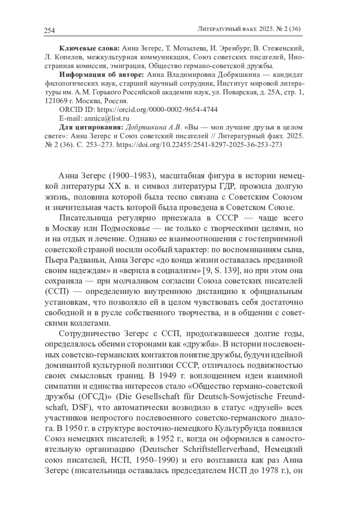 Анна Зегерс (1900-1983) - не только ключевая фигура литературы ГДР, но и важнейший участник послевоенного советско-германского диалога - до последнего времени мало интересовала исследователей, как германских, так и российских. На немецком языке ее наиболее полная биография и два тома избранных писем были изданы американским германистом австрийского происхождения К. Цель Ромеро; фундаментальные исследования жизни и творчества Зегерс в отечественной германистике отсутствуют. В настоящей статье представлена история отношений Зегерс с Союзом советских писателей СССР (ССП) в послевоенный период. А. Зегерс регулярно приезжала в СССР по приглашению ССП, Комитета по международным Ленинским премиям или по собственной инициативе, не только с творческими целями, но и на отдых и лечение. Писательница состояла в переписке с большим числом советских авторов и литературоведов (Т. Мотылевой, Л. Копелевым, В. Стеженским, И. Эренбургом и др.). Сотрудничество немецкой писательницы и ССП определялось обеими сторонами как «дружба». На материале сохранившихся в двух архивах (в московском РГАЛИ и берлинском Архиве Анны Зегерс) писем в статье рассматриваются основные линии отношений писательницы с советскими коллегами. Несмотря на то, что в истории послевоенных советско-германских контактов понятие дружбы, будучи идейной доминантой культурной политики СССР, означало деловое партнерство, автор статьи приходит к выводу о действительно теплых и доверительных отношениях между Анной Зегерс и ее советскими друзьями.