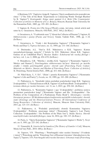4. Бройтман С.Н. Заглавие в книге К. Вагинова “Опыты соединения слов посредством ритма” // Контрапункт: Книга статей памяти Г.А. Белой. М.: Изд. центр РГГУ, 2005. С. 195-203.