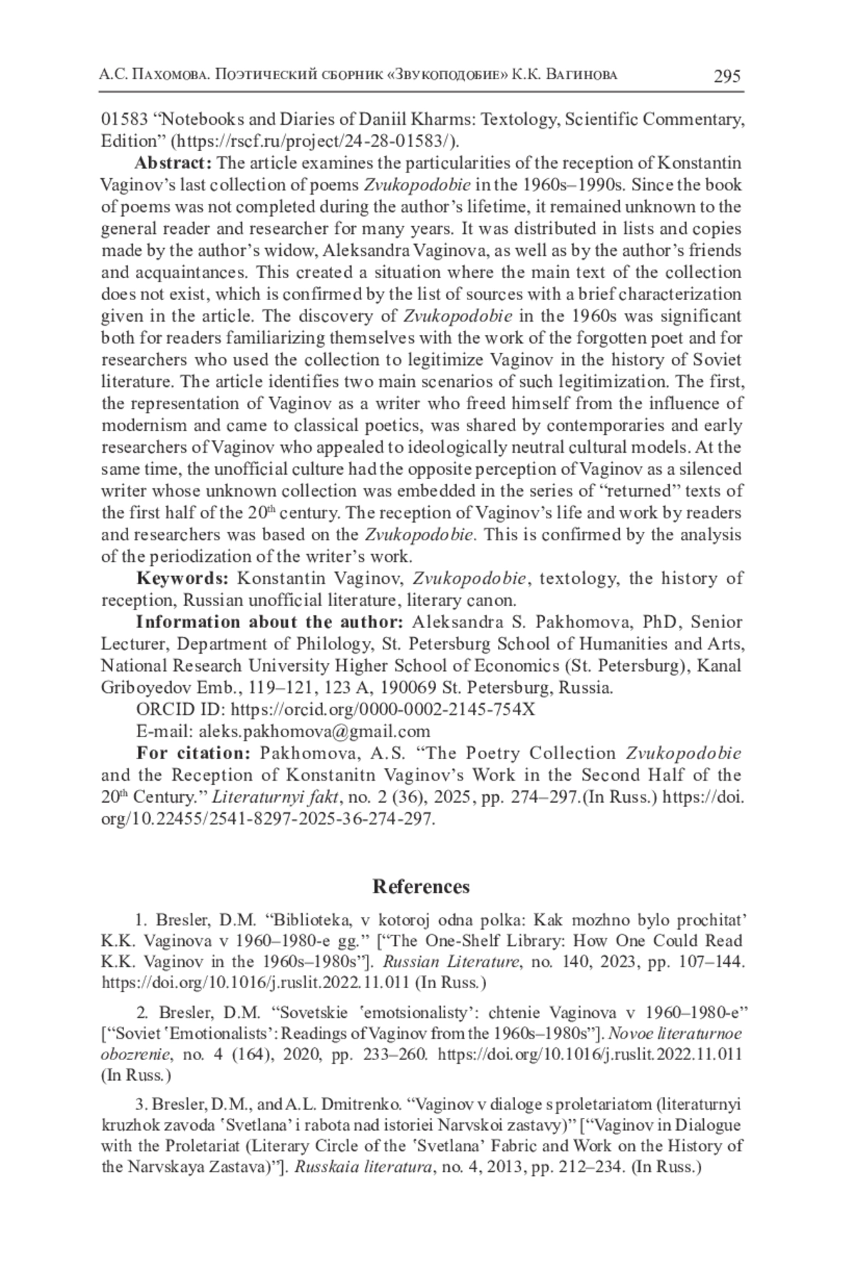 2. Бреслер Д.М. Советские “эмоционалисты”: чтение Вагинова в 1960-1980-е // Новое литературное обозрение. 2020. № 4 (164). С. 233-260. DOI: 10.1016/j.ruslit.2022.11.011 EDN: TXAGYD