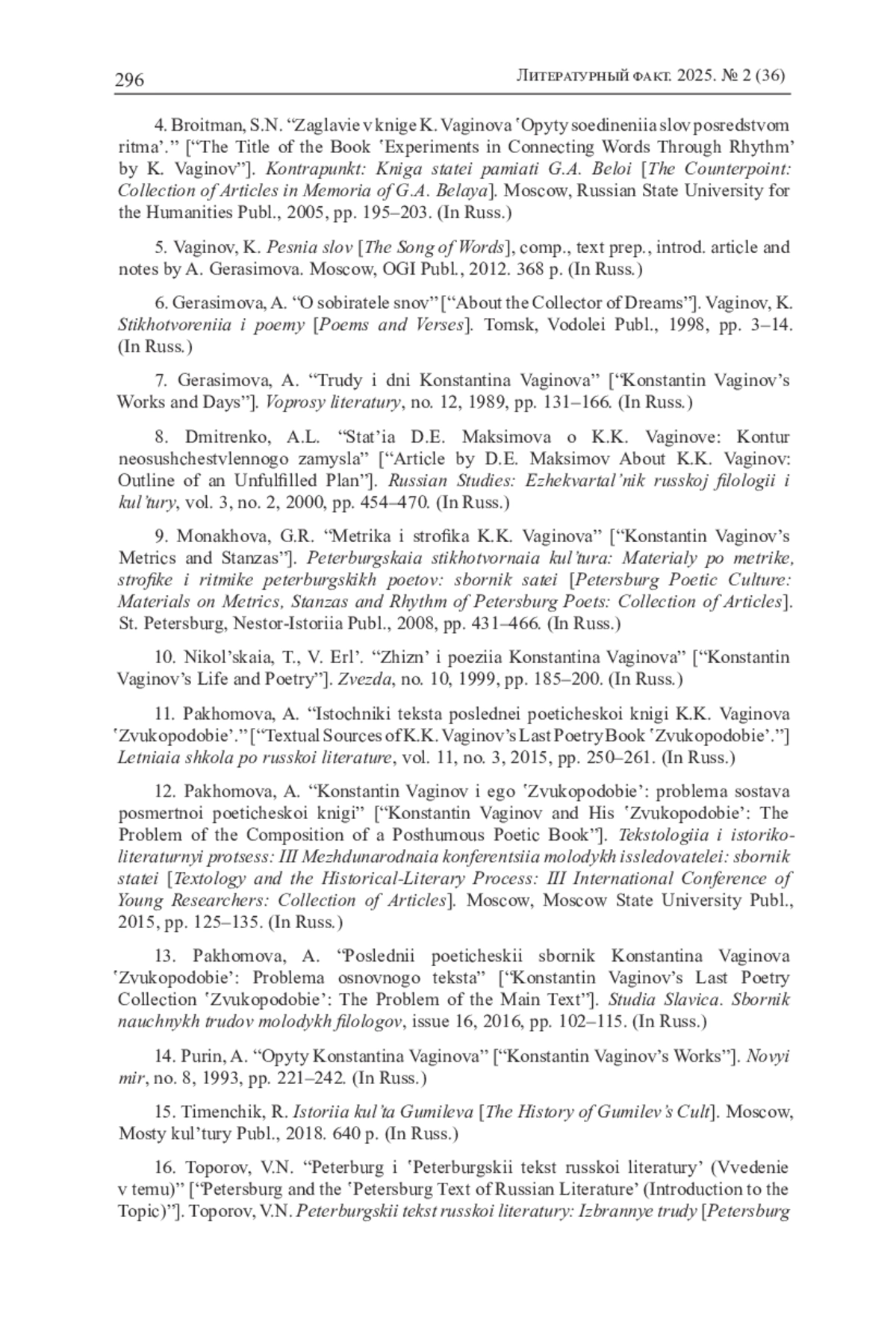9. Монахова Г.Р. Метрика и строфика К.К. Вагинова // Петербургская стихотворная культура: Материалы по метрике, строфике и ритмике петербургских поэтов: сб. ст. СПб.: Нестор-История, 2008. С. 431-466. EDN: MZGCBW