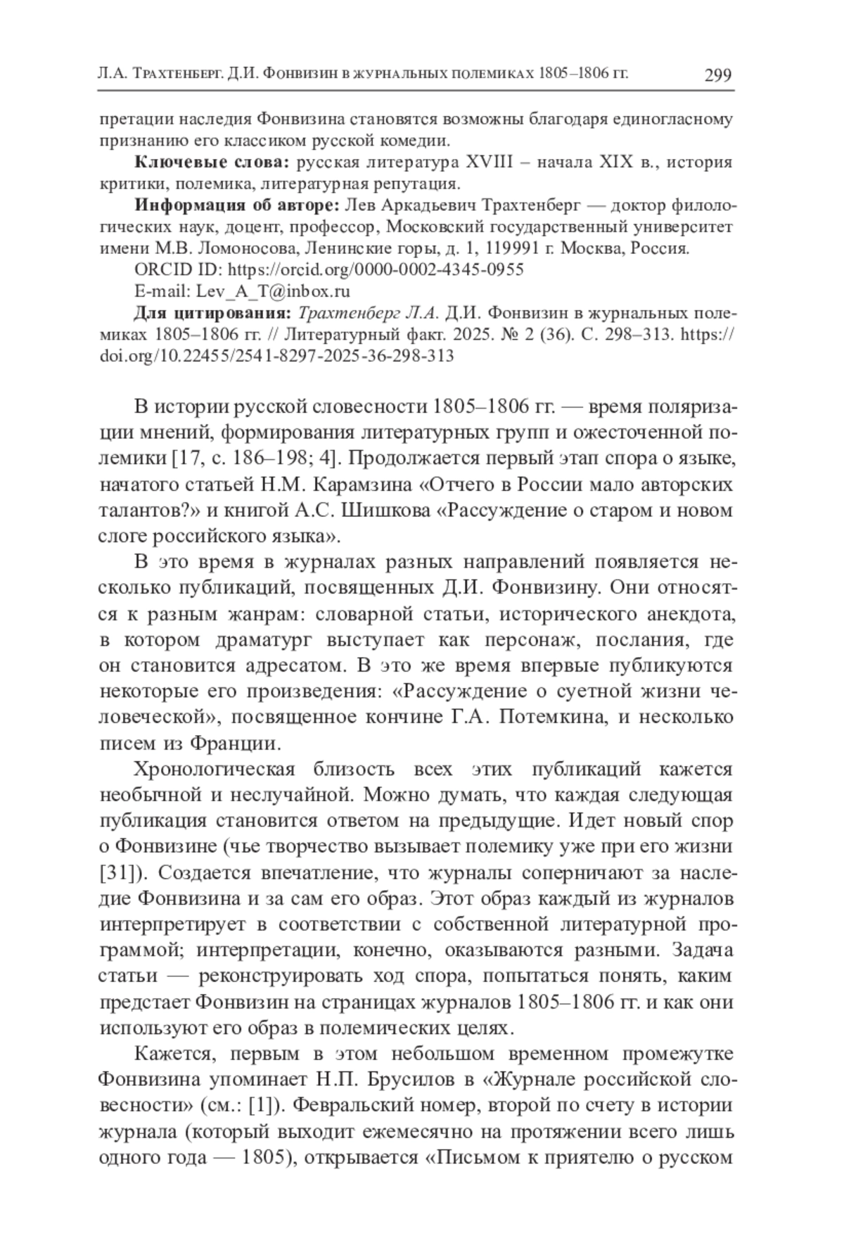 В статье показано, что в 1805-1806 гг. в русских литературных журналах разворачивается обсуждение творческого наследия и личности Д. И. Фонвизина. О нем пишут «Журнал российской словесности» Н. П. Брусилова, «Северный вестник» И. И. Мартынова, «Журнал для пользы и удовольствия» А. Варенцова, «Друг просвещения» П. И. Голенищева-Кутузова, Г. С. Салтыкова и Д. И. Хвостова. «Журнал для пользы и удовольствия» и «Вестник Европы» М. Т. Каченовского в это же время публикуют ранее не издававшиеся произведения Фонвизина. Все, кто пишет о Фонвизине, едины в главном - в высшей оценке его творчества. Брусилов ставит его рядом с Мольером, а также с русскими классическими авторами, в том числе Карамзиным. Здесь можно видеть жест уважения к Карамзину в то время, когда его литературная репутация вызывает споры. Дискуссия начинается вокруг личности Фонвизина. В «Северном вестнике» появляется анекдот, показывающий не только его остроумие, но и самообладание, с которым он переносит болезнь. В «Журнале для пользы и удовольствия» этот анекдот подвергается критике; вскоре в этом издании публикуется «Рассуждение о суетной жизни человеческой», написанное Фонвизиным в конце жизни, которое иллюстрирует другую сторону его характера - христианское смирение. Этот же взгляд отражает статья о Фонвизине для словаря русских писателей еп. Евгения (Болховитинова), помещенная в «Друге просвещения». Она затрагивает и языковую концепцию комедиографа, представляя его как предшественника архаистов - литературной «партии» А. С. Шишкова. В «Вестнике Европы» печатаются письма Фонвизина к П. И. Панину из Франции. Высказанные в них критические суждения о французах в момент публикации приобретают особую актуальность, будучи созвучны настроениям русского общества после Аустерлица. Наконец, Хвостов в оде «К Денису Ивановичу Фонвизину», представляя драматурга как образцового сатирика, обращается к нему в своей критике современного общества и словесности России. Таким образом, сторонники разных литературных лагерей, от карамзиниста Брусилова до шишковиста Хвостова, апеллируют к произведениям, а главное - к образу Фонвизина, чтобы его авторитетом подкрепить свои позиции. Споры об интер- Л. А. Трахтенберг. Д. И. Фонвизин в журнальных полемиках 1805-1806 гг. 299 претации наследия Фонвизина становятся возможны благодаря единогласному признанию его классиком русской комедии.